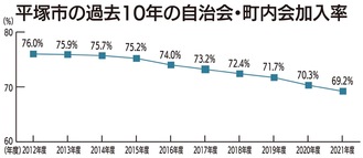 全国的に「自治会・町内会」加入率の低下が課題となっている。平塚市でも、2012年度に76%だった加入率が21年度には69・2%となり、自治会に加入する世帯が減少しつつある。