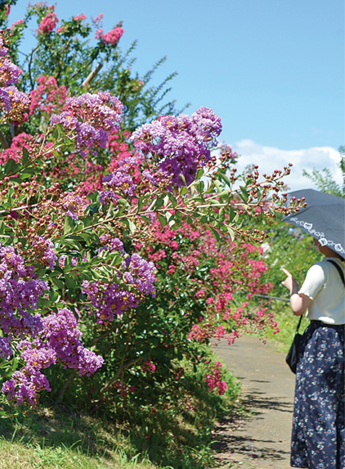 中国原産の花木で、枝の先に小さな花が房のように咲くのが特徴。同園には90品種、約280本が園内の道に沿って植えられており、赤や紫、白など色とりどりの花が楽しめる。見頃は例年8月末まで続くという。