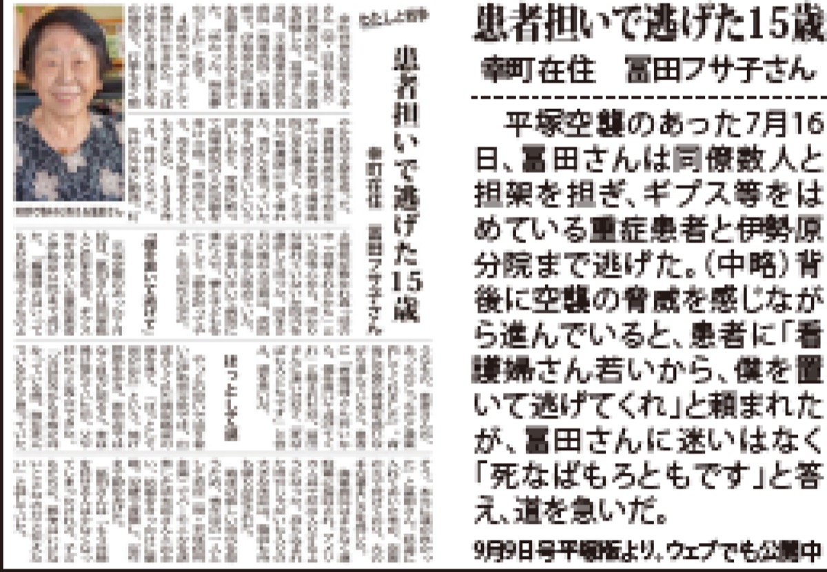 源一郎さんが入院していた海軍病院で看護師をしていたのが冨田フサ子さん(92)だ。冨田さんは平塚空襲があった7月16日の夜、同僚数人と担架を担いでギプスをはめていた源一郎さんを伊勢原分院まで運んだ。自力で動けなかった源一郎さんは、病院の防空壕に一番最後に入っていたため、市外へと逃げるときには、真っ先に外へ出ることができたという。