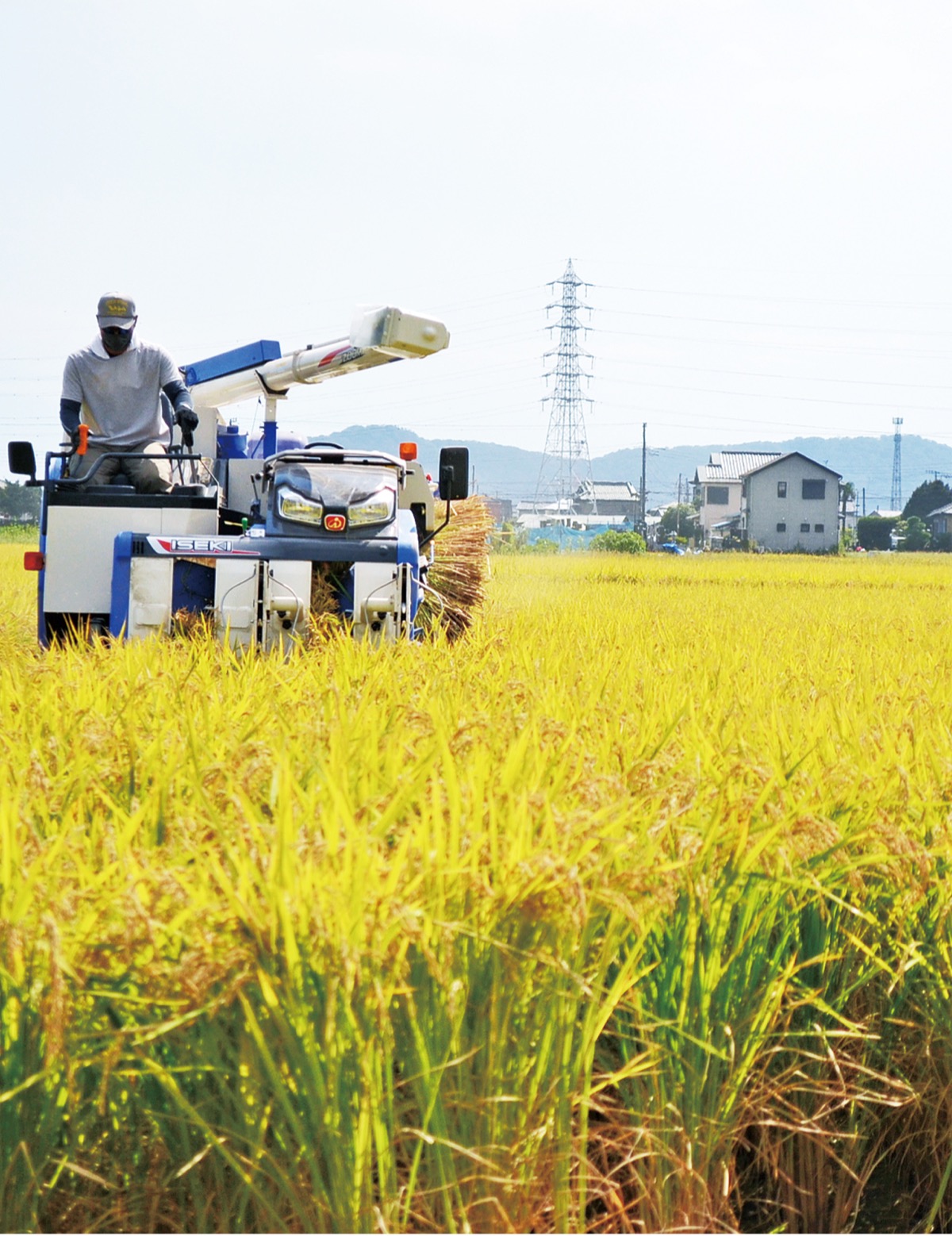神奈川県内1位の米の栽培面積を誇る水田地帯–平塚市。平塚生まれの米「はるみ」が収穫シーズンを迎え、9月21日には、市内小鍋島にある大庭健一さん(45)の田んぼで収穫作業が行われた=写真。