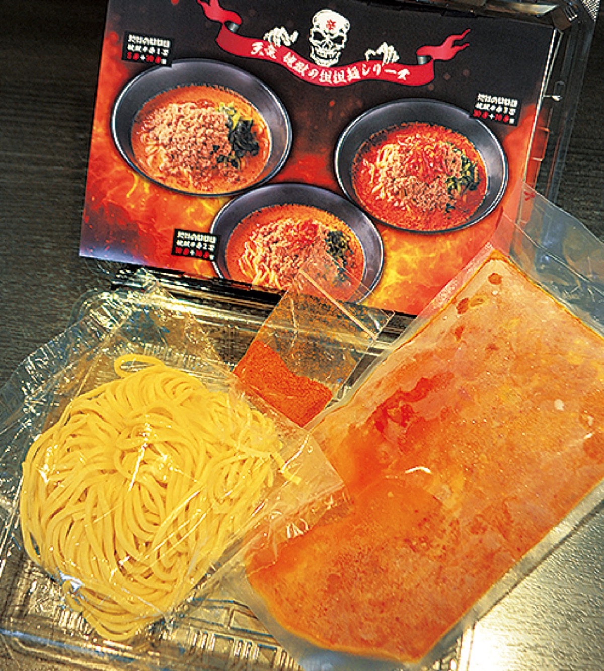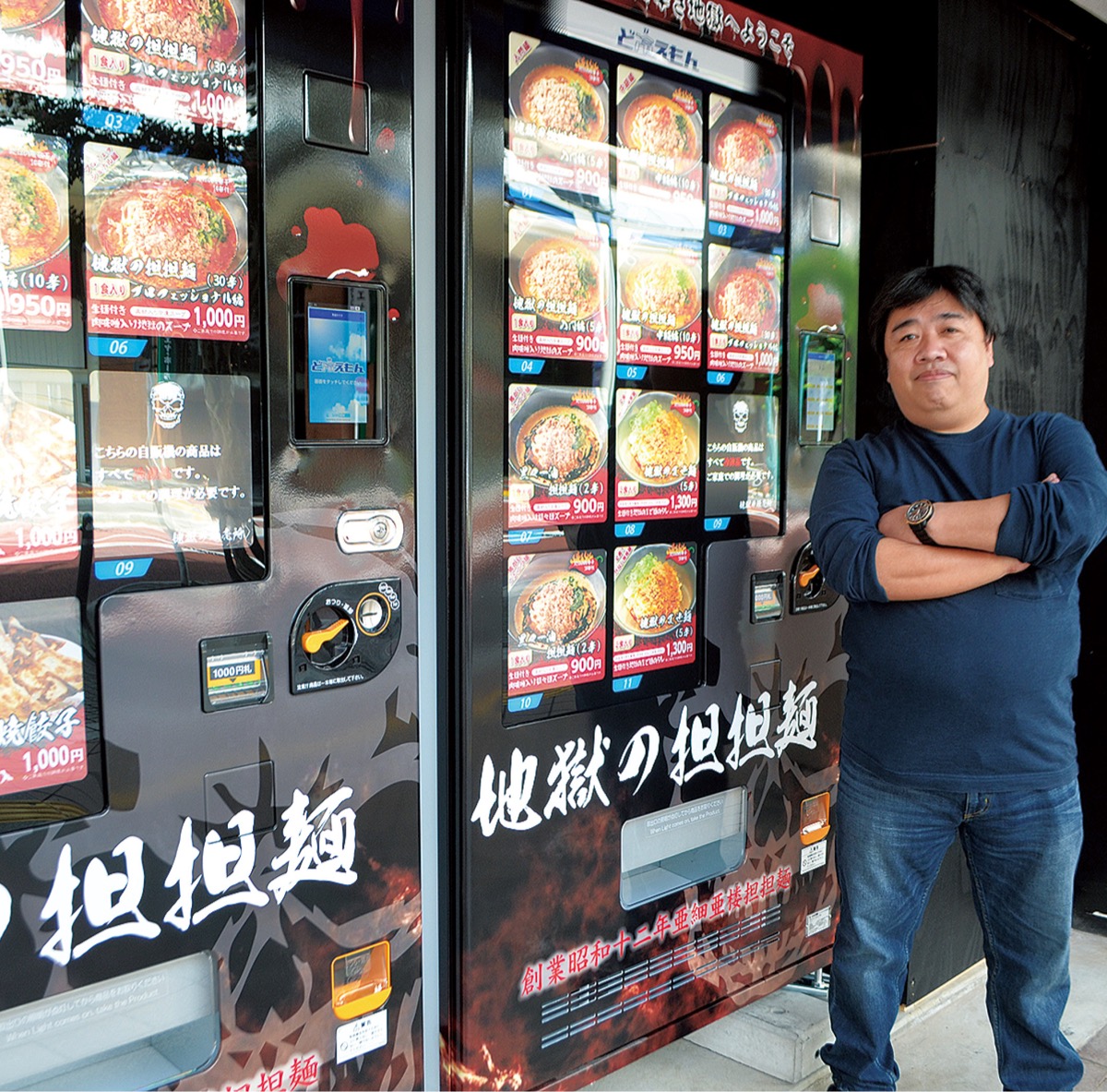 2台並ぶ冷凍ラーメンの自販機、その名も「地獄の担担麺直売所」 。ラインナップには同店人気メニューの「入門編」(900円)から焼餃子、まぜ麺まで。瞬間冷凍したスープと麺を湯煎することで、店と同じ味を自宅で味わうことができる。中山社長は「長時間寝かせている分、お店よりも美味しいかもしれない」と不敵な笑み。