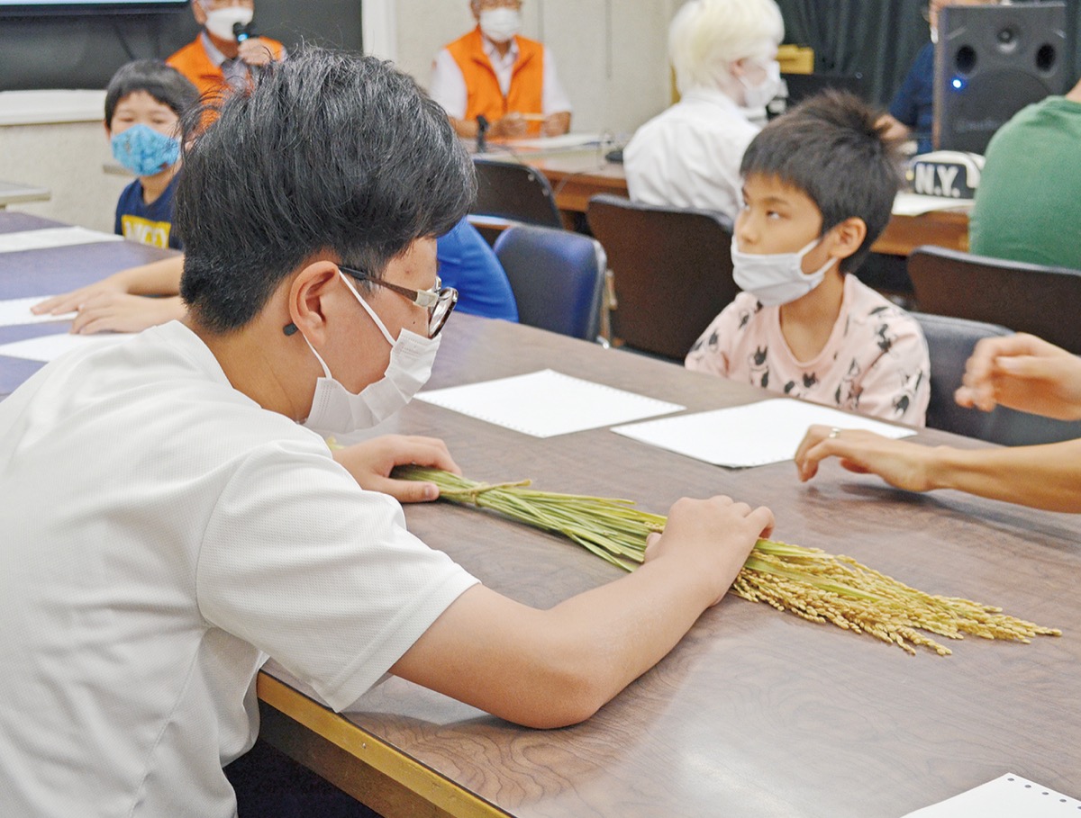 「秋の金目の空気を感じてください」と金目エコミュージアムのメンバーが持参した「はるみ」の稲穂が配られると、小学部の生徒たちは「ツンツンしてる」「泥の匂いがする」など、稲作のさかんな金目の秋を体験していた。