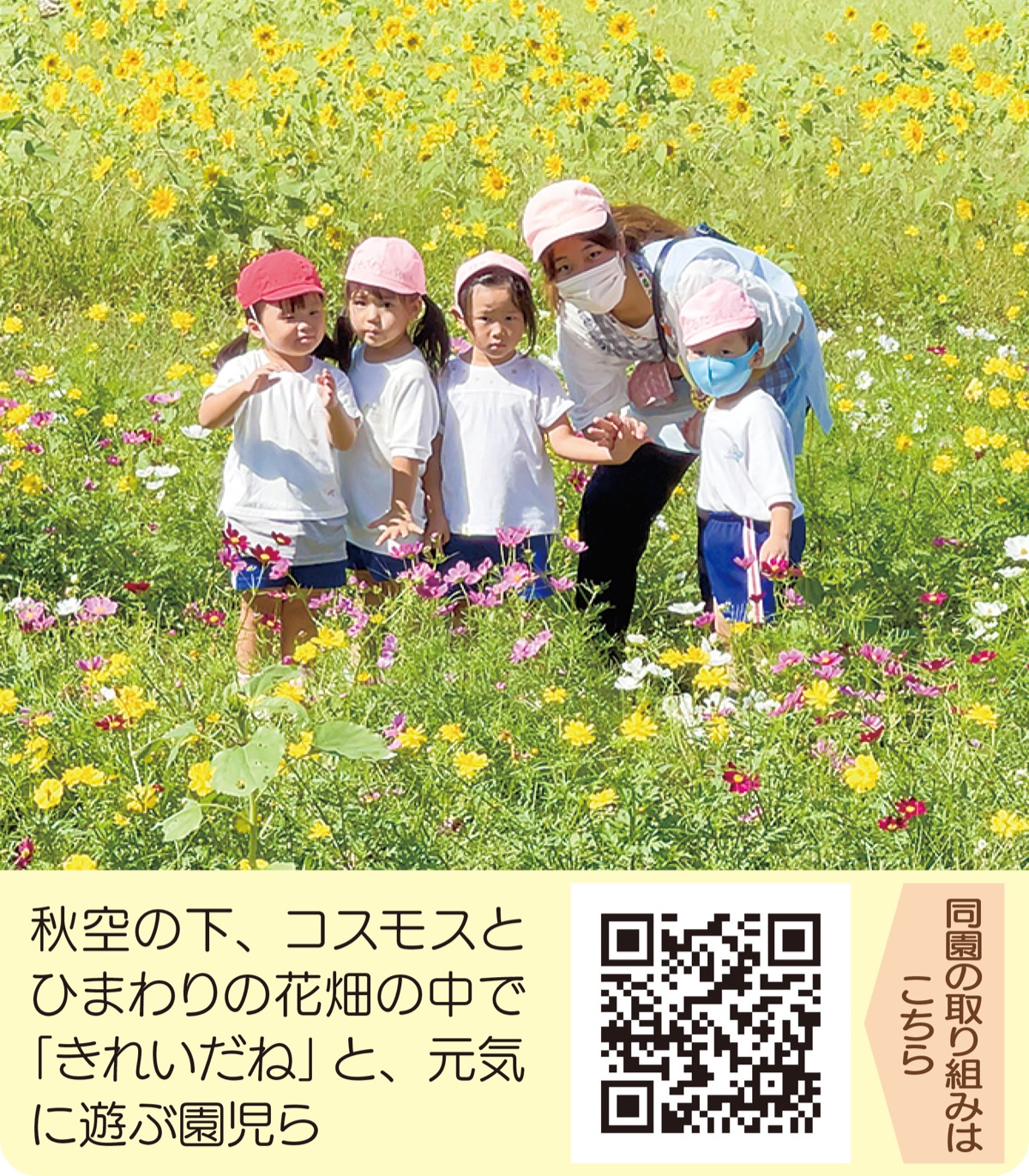 田園地帯にある「認定美里・柿の実こども園」は、畑に囲まれ自然に触れられる環境を活かし、のびのびと実体験から学ぶ保育を実践している。