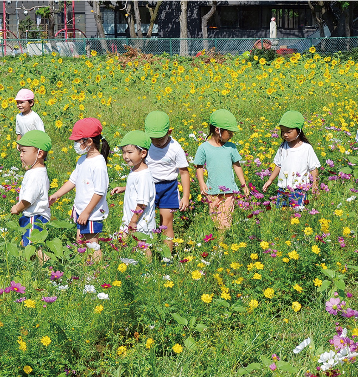 花畑の中で、「きれいだね、かわいいね」と言いながら、自由に遊ぶ園児の姿が見られた=写真。