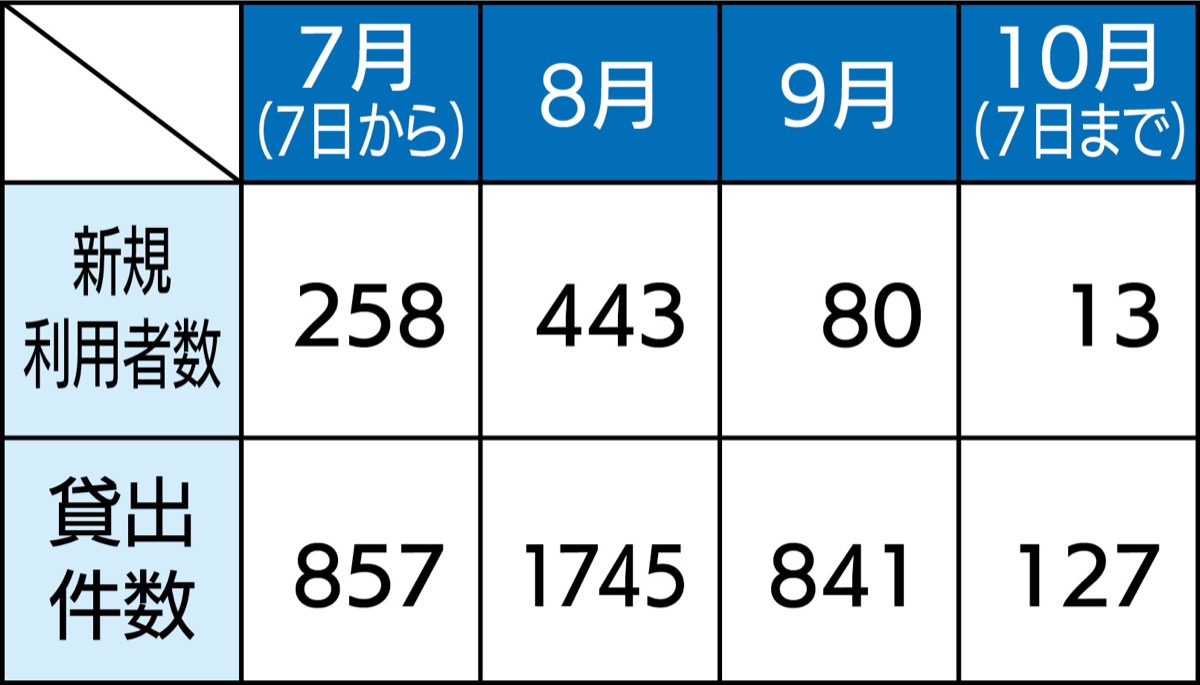 同館の電子図書館は7月7日からサービスを開始。図書館の会員登録をし、5年以内に図書館を利用した人に向けて電子図書館が利用できるパスワードを自動発行した。発行した人数は7万8789人(8日時点)、実利用者数は3カ月間で794人だった。