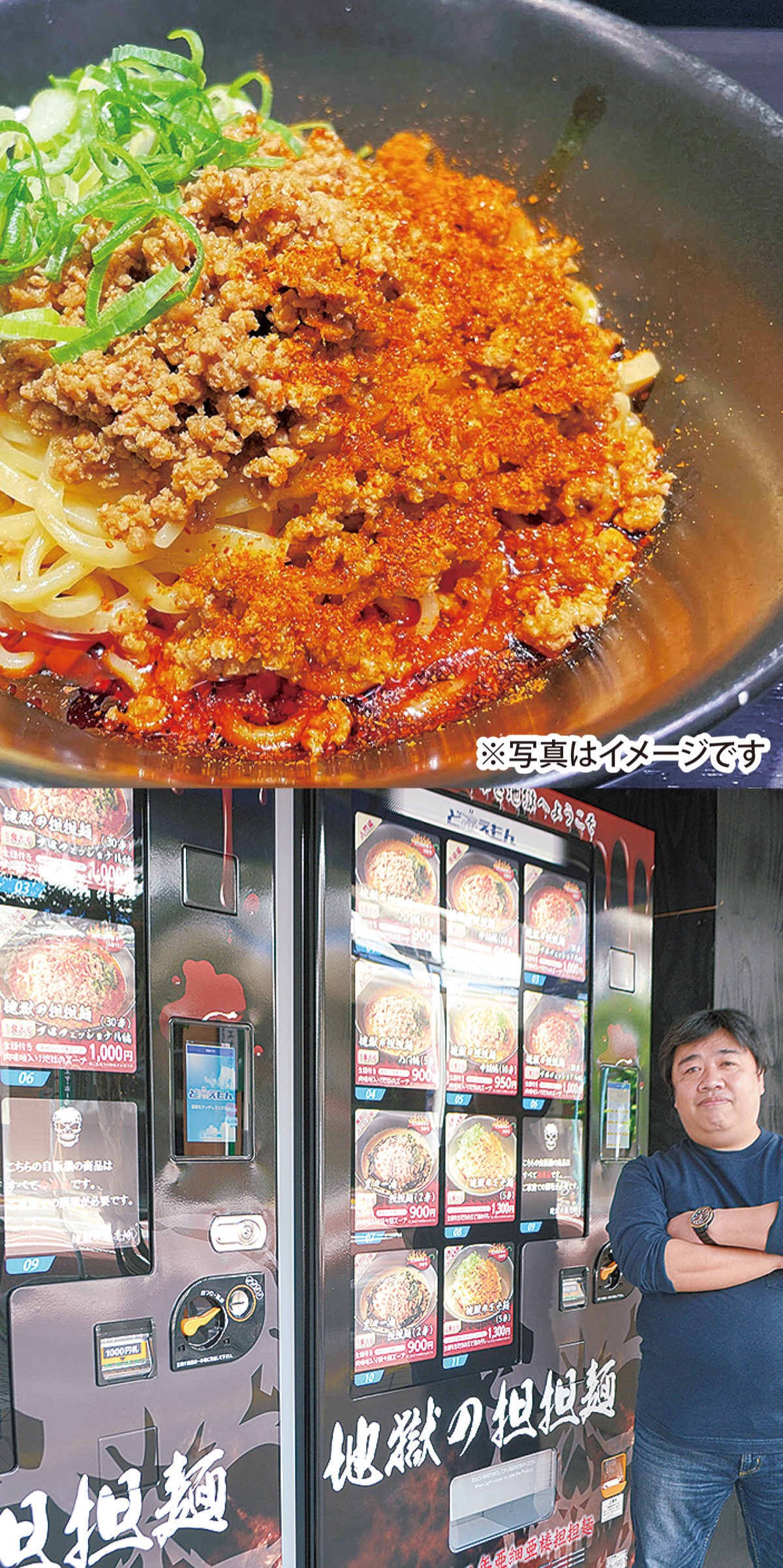 自販機ではもちろん担担麺も販売中。中山社長は「入門編でも相当辛いので注意を」とにやり。