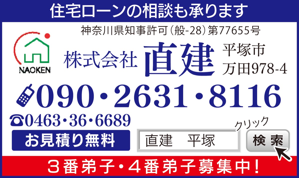 完全自社施工の(株)直建(高瀨直也社長)の従業員で、一番弟子の克也さん邸が完成した。10月30日(土)・31日(日)、内覧会を開催。会場は「大磯町高麗2丁目25の26」(ファミマ平塚山下店近く)。9時〜17時。予約不要、お土産付。駐車場あり。見るだけ歓迎。