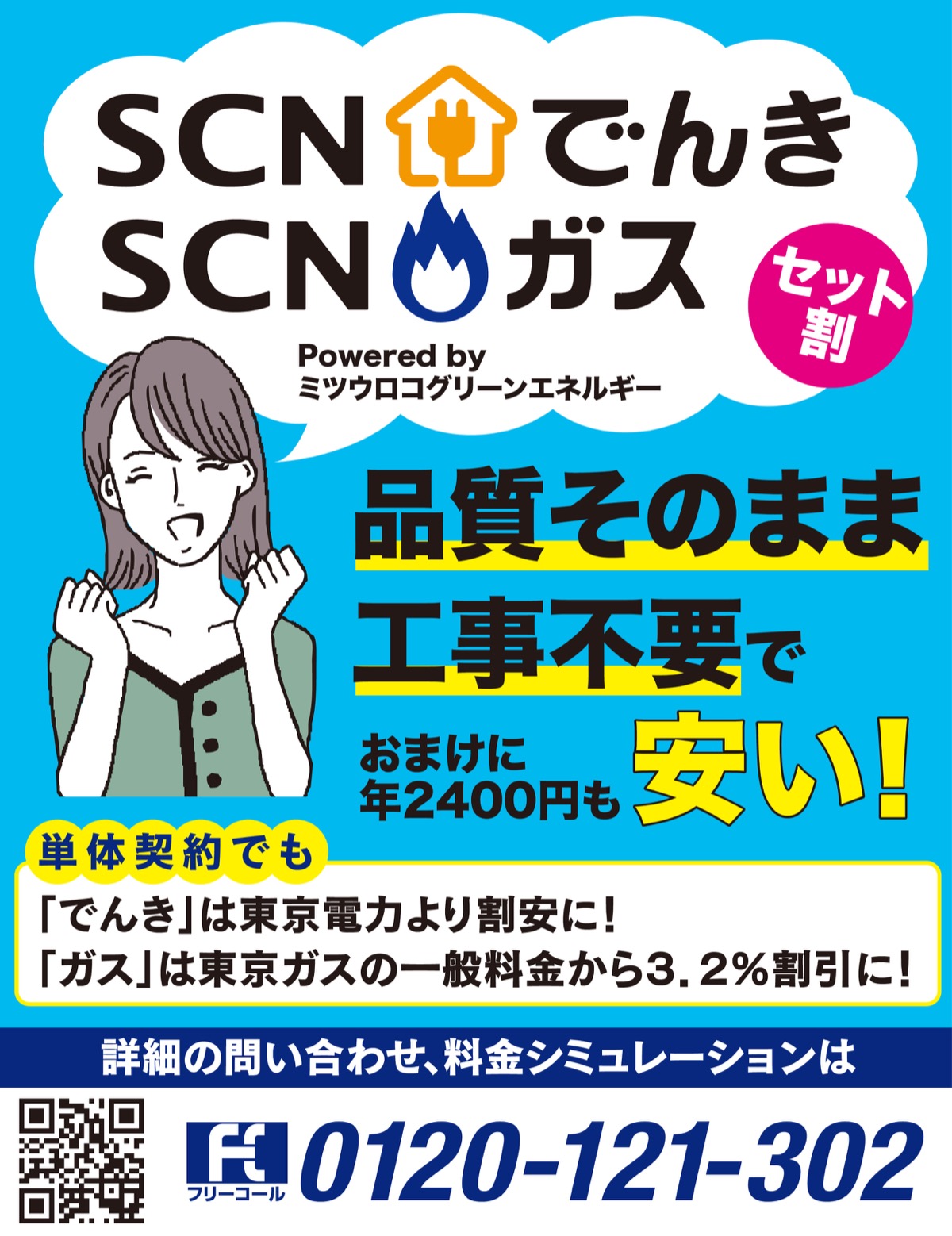 全国的に電気・ガスの値上げ傾向が続く中、「SCNでんき」なら使用量に応じて東京電力より割安に。さらにケーブルテレビやケーブルインターネット等、同社サービスとのセット割で月200円、年間2400円も安くなる。