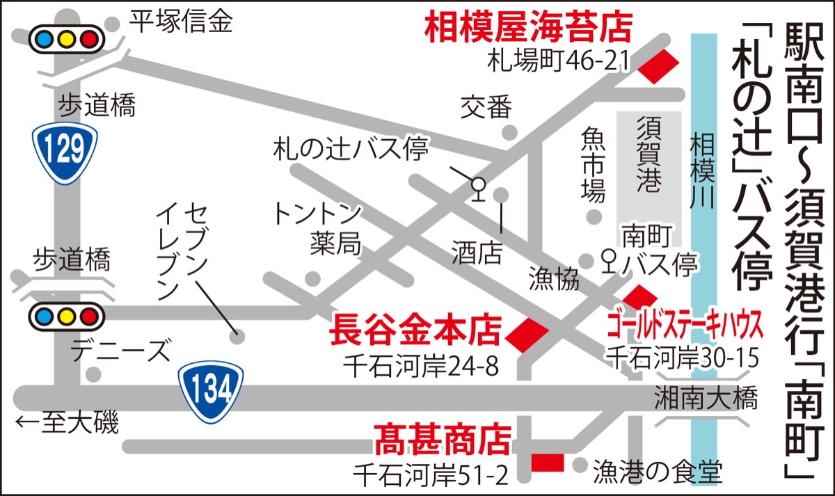 海苔加工問屋「相模屋海苔店」、干物製造直売店「高甚商店」、花かつお製造元乾物店「長谷金本店」、ステーキ店「ゴールドステーキハウス」の須賀の4店舗が11月26日(金)から28日(日)まで感謝セールを同時開催する。