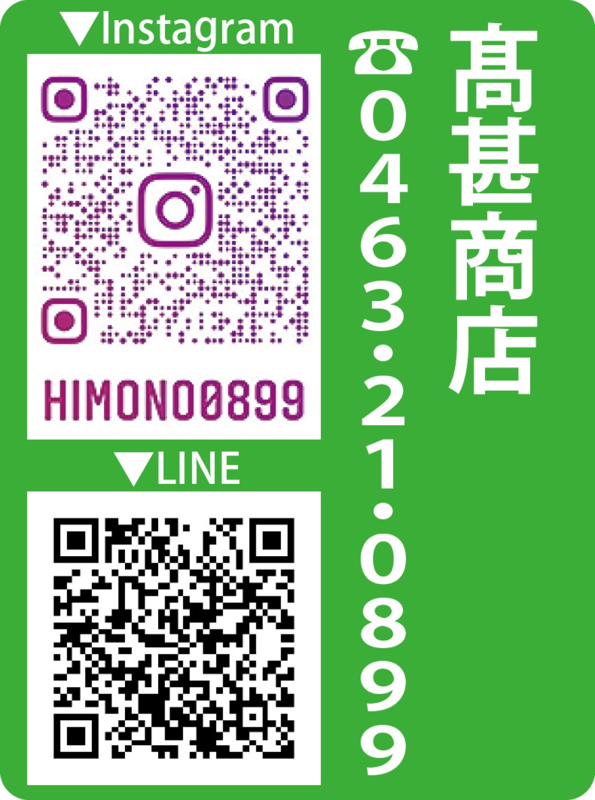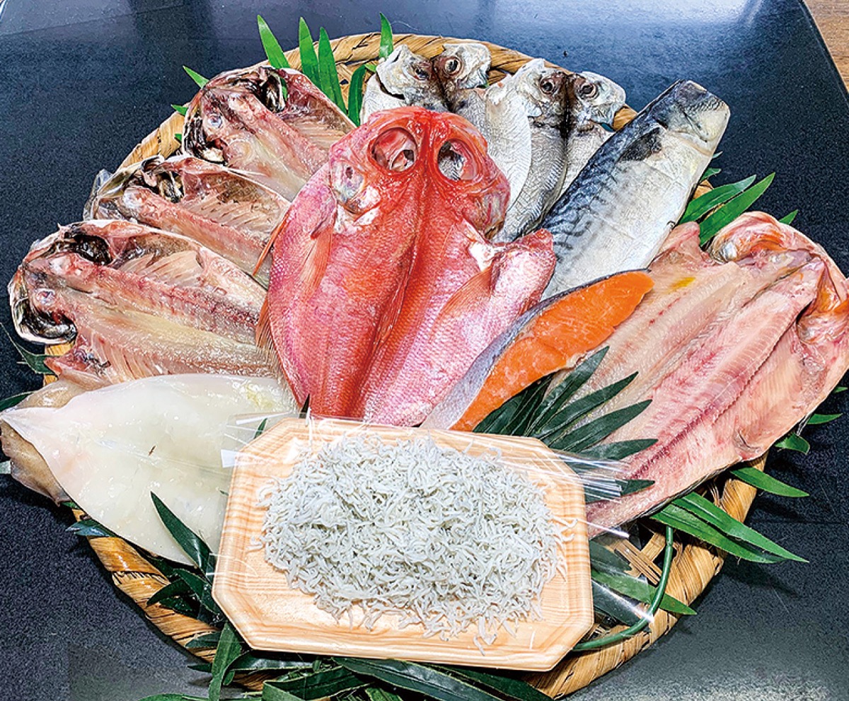 感謝セールは11月26日(金)〜28日(日)で特価品を用意。1千円以上購入で翌月から使用できる100円引券、お店のSNS登録でさらに干物を進呈。午前10時〜午後4時半。お歳暮限定セット(送料込4500円)は特選鯵・大えぼ鯛・さば・鮭・ほっけ・イカ・金目鯛の干物7種10枚にしらす干しを添えた。セットは2300円〜。単品は特大ほっけ(470円)や地場産太刀魚(420円)、など。※各税込