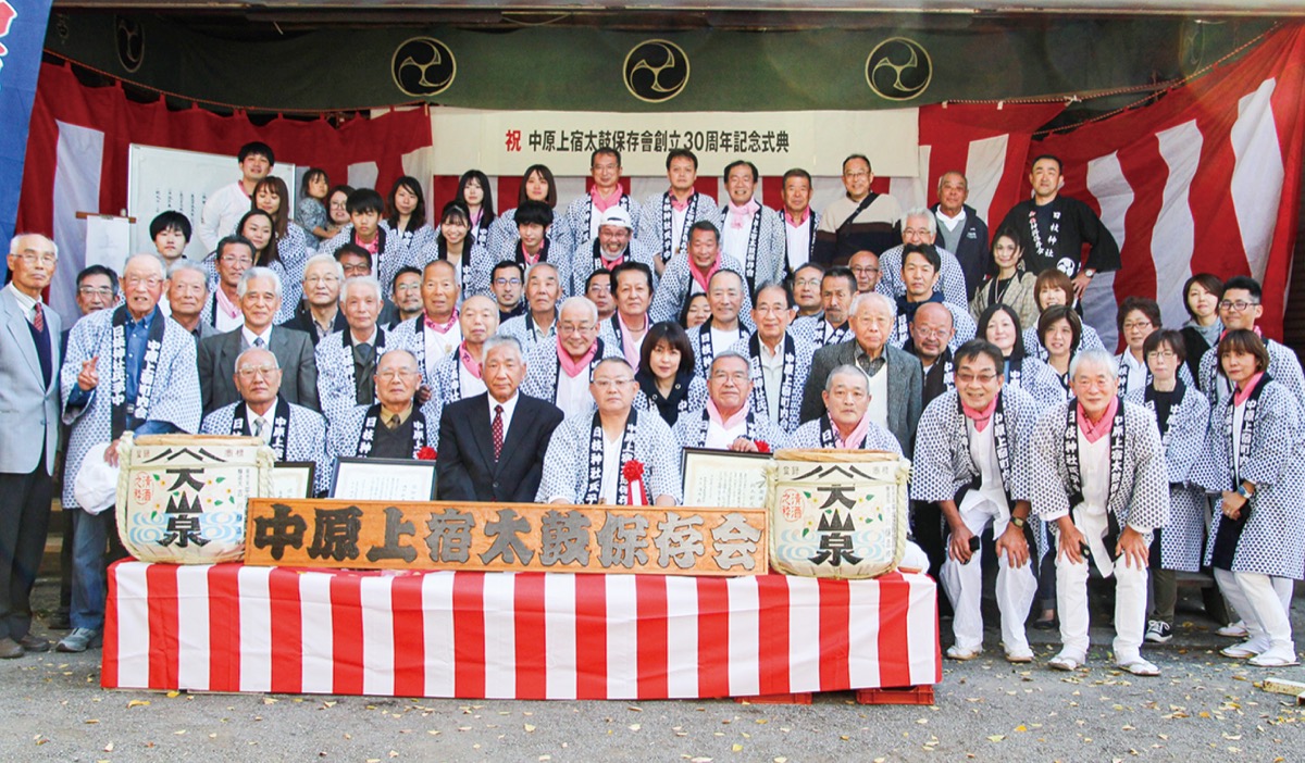 上宿太鼓保存会(酒井敦会長)の設立30周年を祝う記念式典が11月14日、日枝神社で開催され約150人の地域住民でにぎわった。