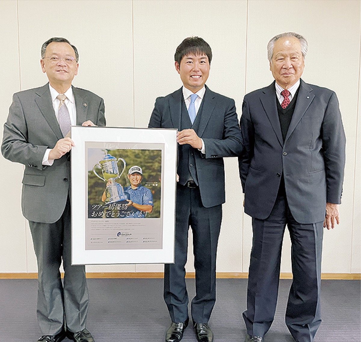 10月に千葉県で行われた「ブリヂストンオープンゴルフトーナメント」で初優勝した、レイクウッドコーポレーション所属の杉山知靖選手(28・写真中央)が9日、スポンサーである(株)福澤の福澤正人代表と市役所を訪れ、落合克宏市長に喜びを報告した。