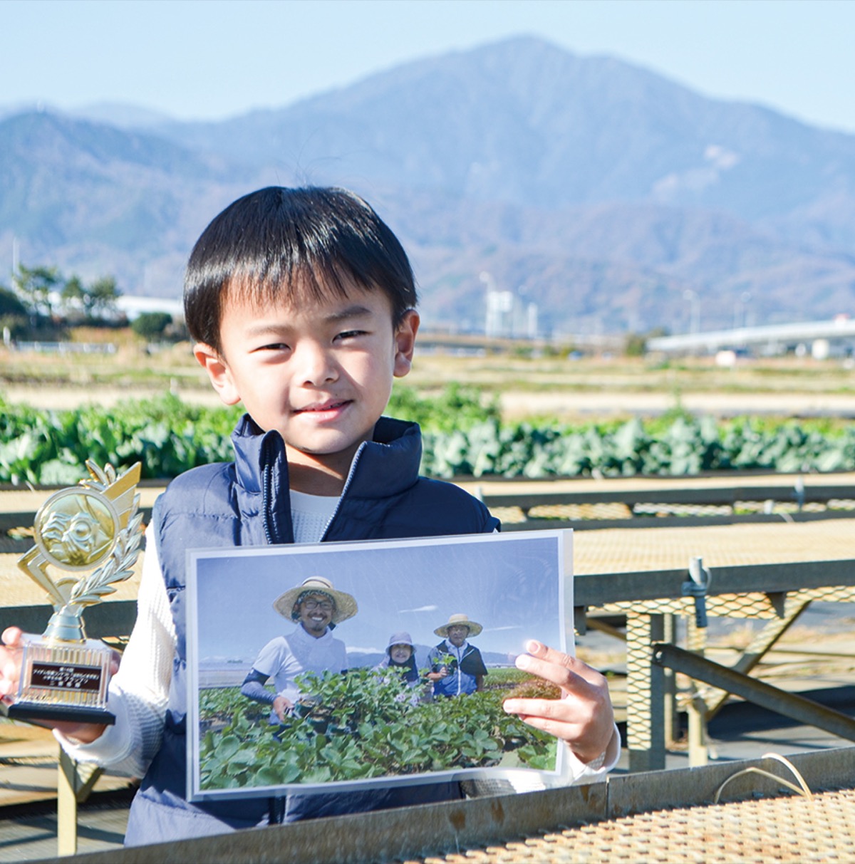 二宮さんは夏休みの宿題として同コンテストに挑戦。暑い日も雨の日も世話をするイチゴ農家の父と祖父、祖母を被写体に今年8月、ハウスに植えるためのイチゴを育苗する姿を写した。父のスマートフォンを借りて何度も撮影し、「ぼくのおうちはいちごのうか」と題して提出した。