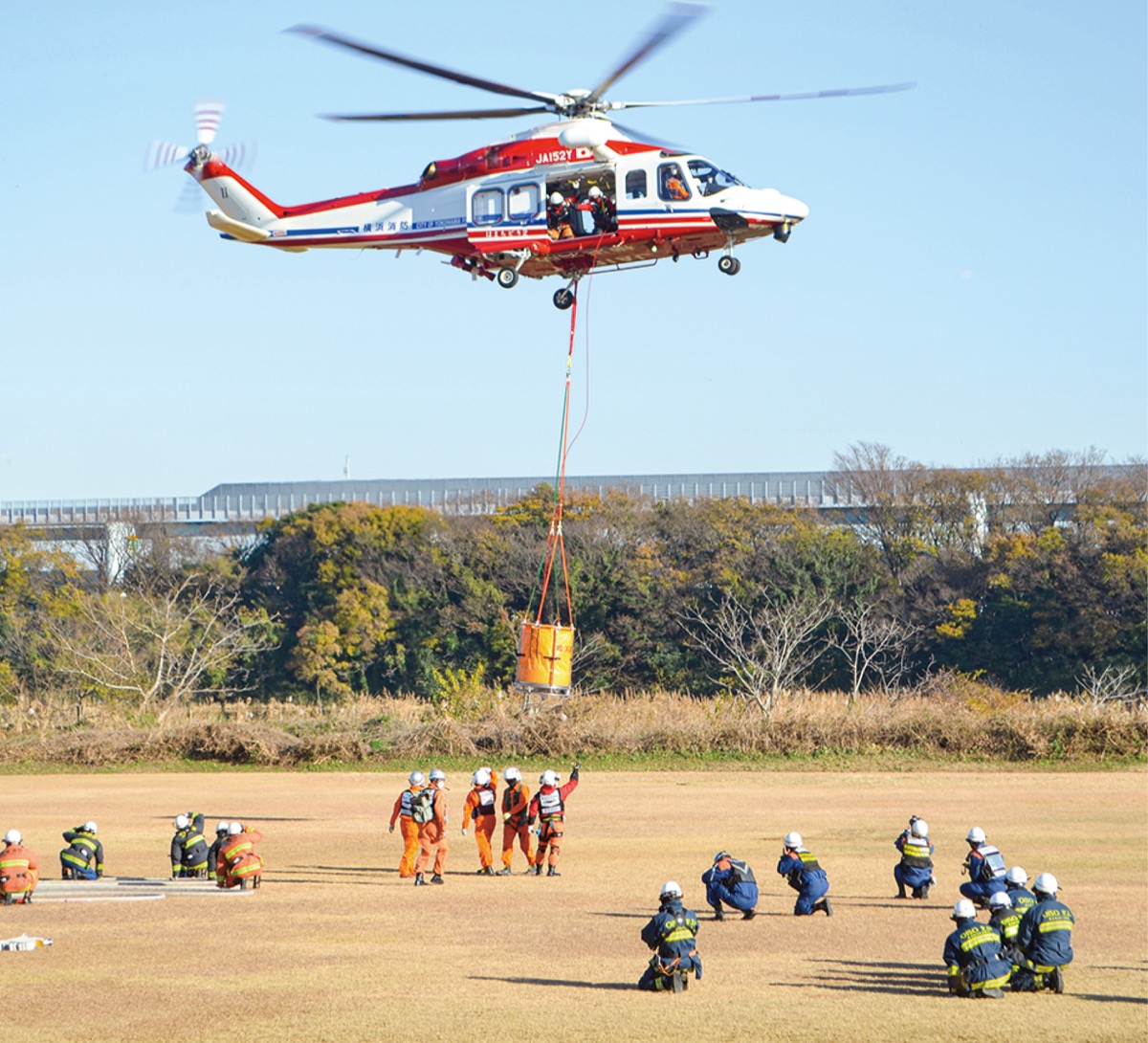 平塚市消防本部と近隣消防本部、横浜市消防局航空隊が合同で空中消火活動の連携訓練を12月15日、大神スポーツ広場で実施した=写真。