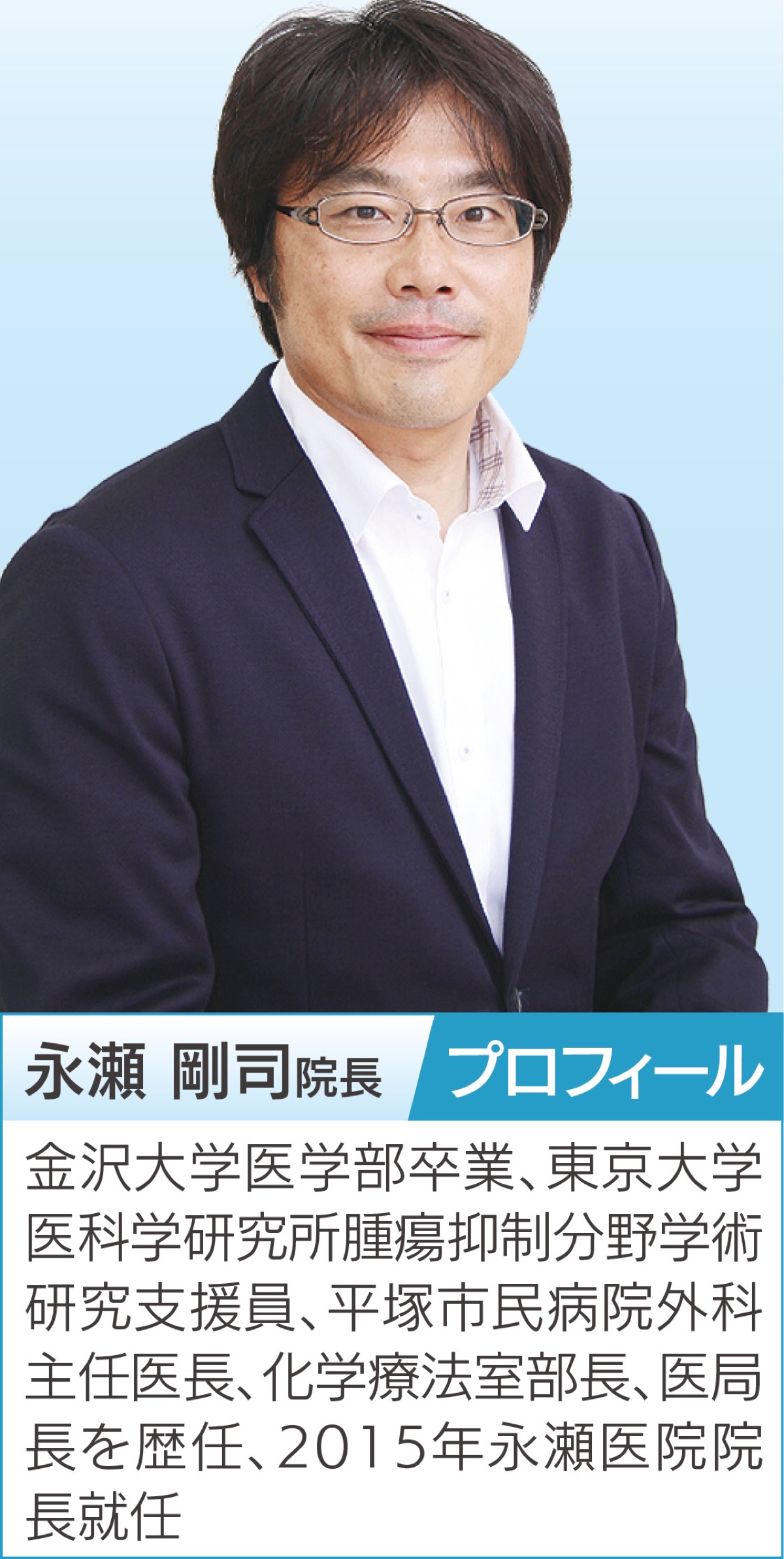 1949年の開業以来、一貫して地域医療にに貢献してきた「永瀬医院」。2015年に3代目に就任した永瀬剛司院長は、消化器外科の医師として専門性を活かしながら、地域に根差した「かかりつけ医」として幅広い診療を行う。「地域の皆さまのホームドクターとしての役目を、今後も果たしていきたい」と話す。