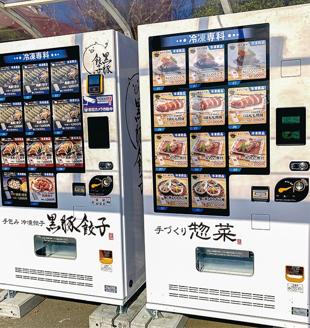 昨年9月、「コロナ禍でなかなか会えないお客様のためにできることを」との想いから、手包み冷凍餃子「黒豚餃子」の自動販売機を設置した和食ファミリーレストラン「だんらん」。この自販機が好評のため昨年12月、新たに「お惣菜類」を追加した自販機を増設した=写真。