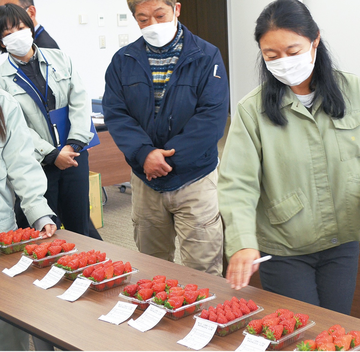 おいしいシーズンを迎えたいちご。JA湘南いちご部会(二宮敏郎部会長)の果実持寄品評会が1月19日、平塚市役所で開催され、鮮度や果実の色づき、形がそろっているかなどの項目で審査された。