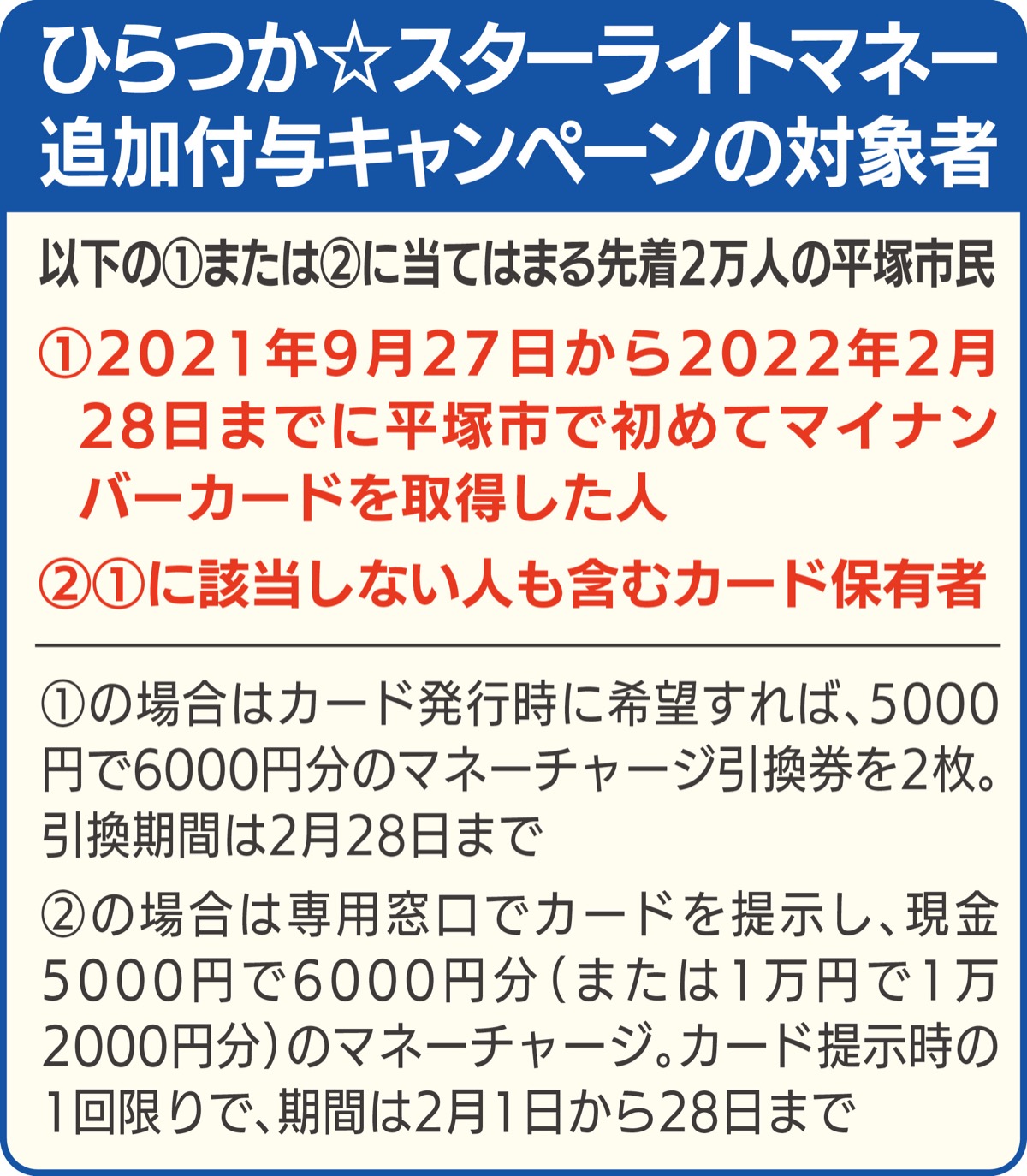 国のマイナポイント事業第2弾に合わせ、平塚市はマイナンバーカードを既に取得している人に対しても電子マネー「ひらつか☆スターライトマネー」を追加付与する市独自の施策を1月21日に発表した。
