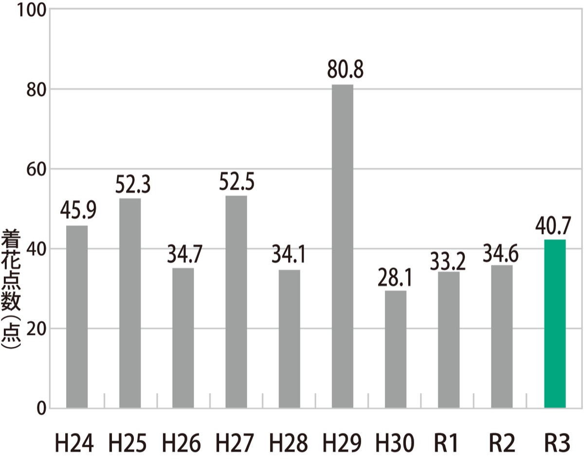 今回の調査では、ヒノキ林40カ所の着花点数の平均値は40・7点となったという。この値は、昨年の34・6点を上回ったものの、過去10年間の平均43・7点を下回った。