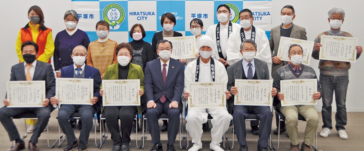 第3回「平塚市みんなのまちづくり事例表彰」の表彰式が3日、市役所で行われ、落合克宏市長が年間大賞に選ばれた9団体に表彰状を贈った(1団体は欠席)。