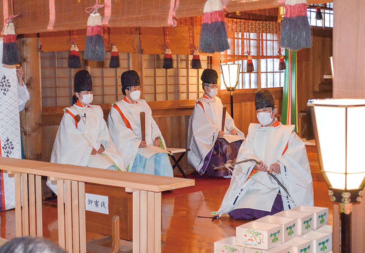 節分祭では、修祓(しゅばつ)を行い心身ともに清めた後、弓箭の祝事や氏子総代による弓矢の行事が行われ、邪気災難を祓い除け、無病息災などが祈念された=写真。