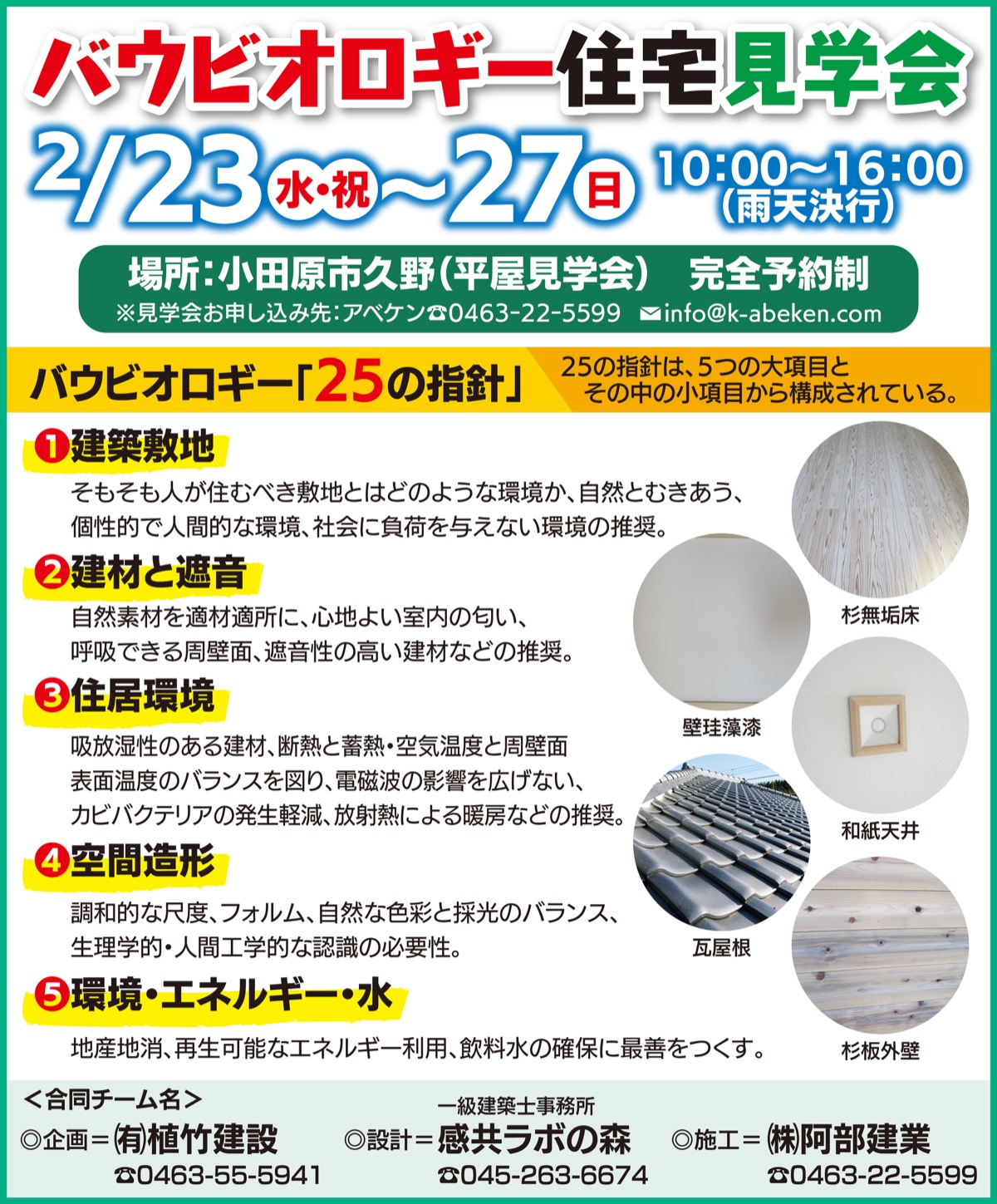 今回見学会が行われる小田原市久野の物件は、バウビオロギーの思想を取り入れた建物となっている。バウビオロギーには、「自然や人工的な障害のない建設敷地を」や「自然換気による良好な空気質を」、「再生可能なエネルギー源を用いてエネルギー消費を軽減すること」など、「25の指針」が示されている。