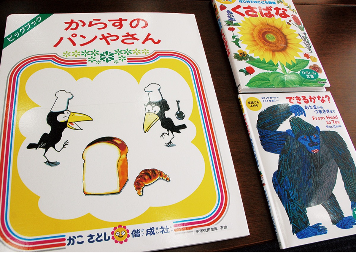 平塚市の図書館側が内容をリクエスト。距離を保ちながら読み聞かせができる天地52センチの大型絵本をはじめ、英語で読める絵本や調べもの学習で活用できる絵本などがラインアップされた。