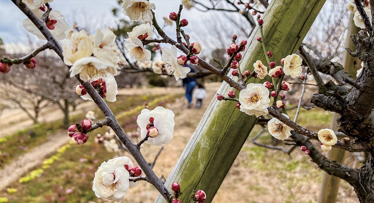 花菜ガーデン(寺田縄)の梅が開花し始めている。2月19日現在で、開花の早い品種は3分咲きほど。気温の低い日が続いたことにより、例年より1週間ほど開花が遅く、全体の見ごろは2月末の見通し。