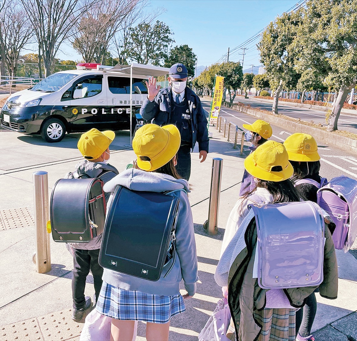 2月25日の午後、須賀公園にアクティブ交番が開設された。3時をまわると下校時間と重なり、港小学校や太洋中学校などの児童・生徒が公園前の信号を横断。署員の元に駆け寄る子どもたちの姿も見られた。