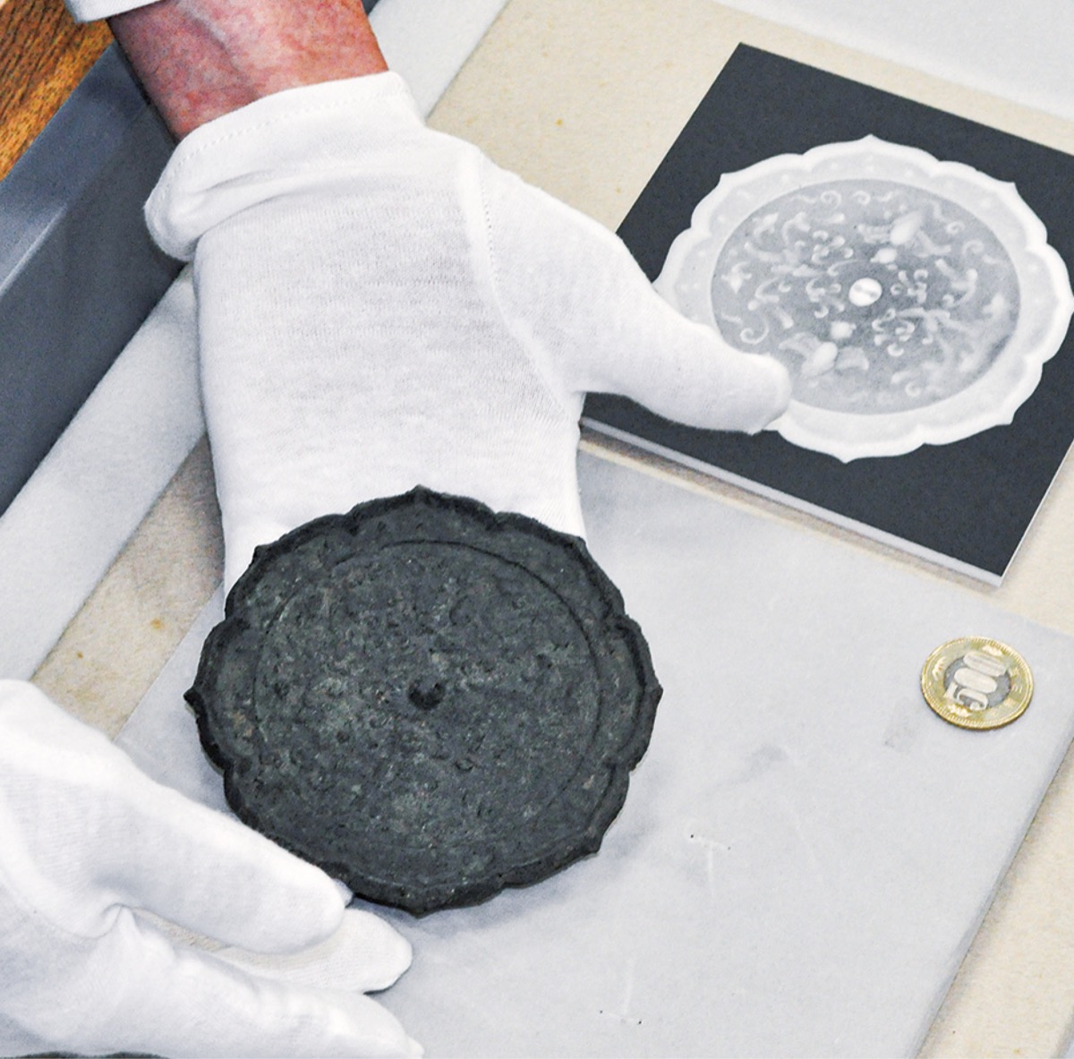 出土した鏡は銅製で、直径111mm、厚さ2・6mm、重さ149g。輪郭部に8つの突起がある「八稜形」と呼ばれる形状で、X線写真では背面に2羽の鳥と草花の文様が描かれていることが分かった。