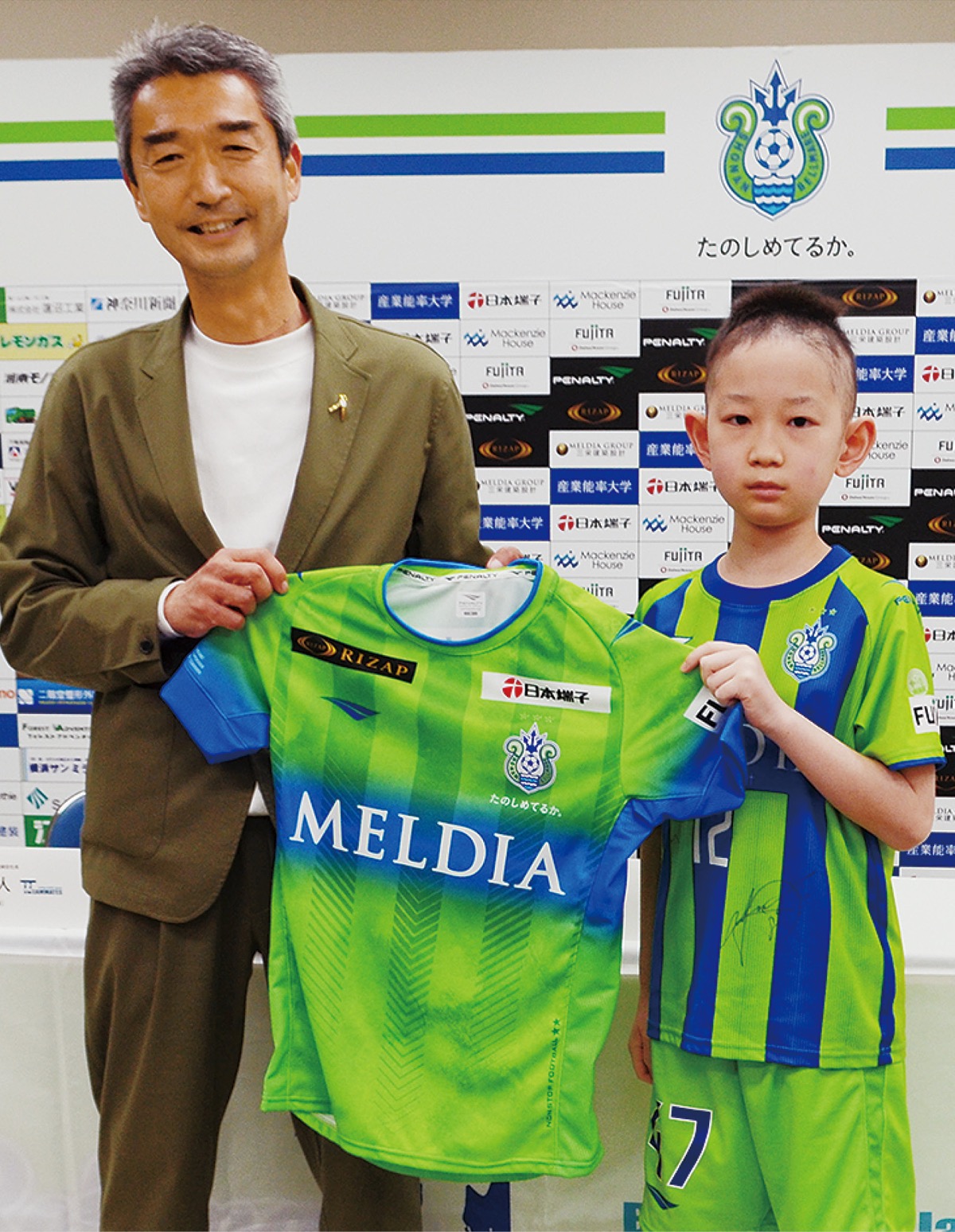 会見では緊張していたが、真新しいユニフォームに袖を通すと笑顔を見せた。背番号「47」を選んだ理由は「選べる中で、一番大きい素数だったから」と説明し、「チームと一緒に練習に参加するのが楽しみ」と意気込んだ。当日は同事業で卒団した橋本琉選手と高田琥太郎選手も駆けつけてエールを送った。ベルマーレの水谷尚人社長は「卒団した二人の成長がうれしい。楓君とも一緒にチームを盛り上げていけたら」と話した。