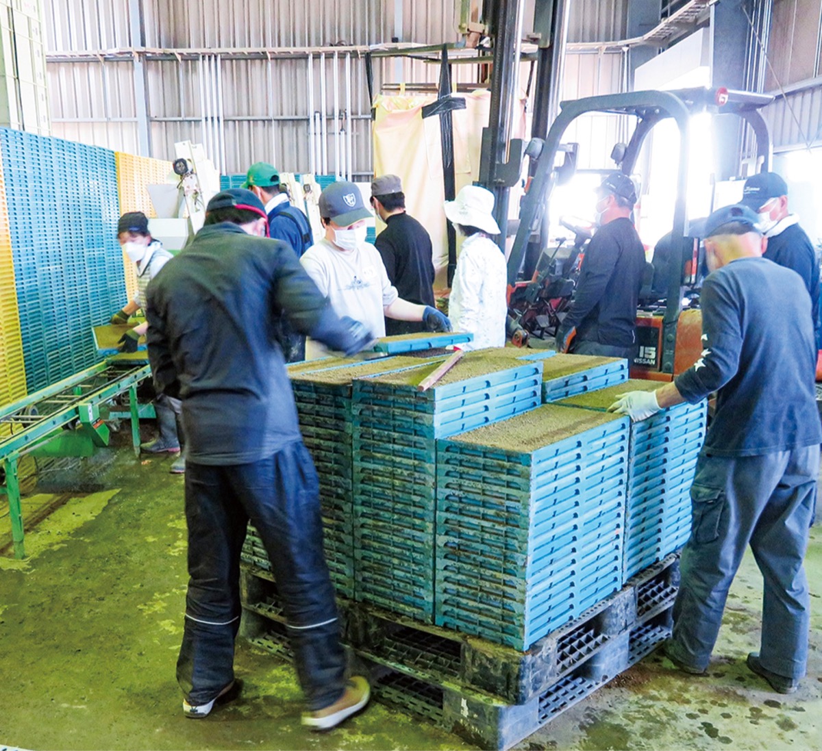 当日は10代から30代までの不登校・ひきこもり当事者が参加し、ベルトコンベヤーで次々と流れてくる育苗トレーを運び出す作業や、農作業に使用する土のう作りなどを行った。