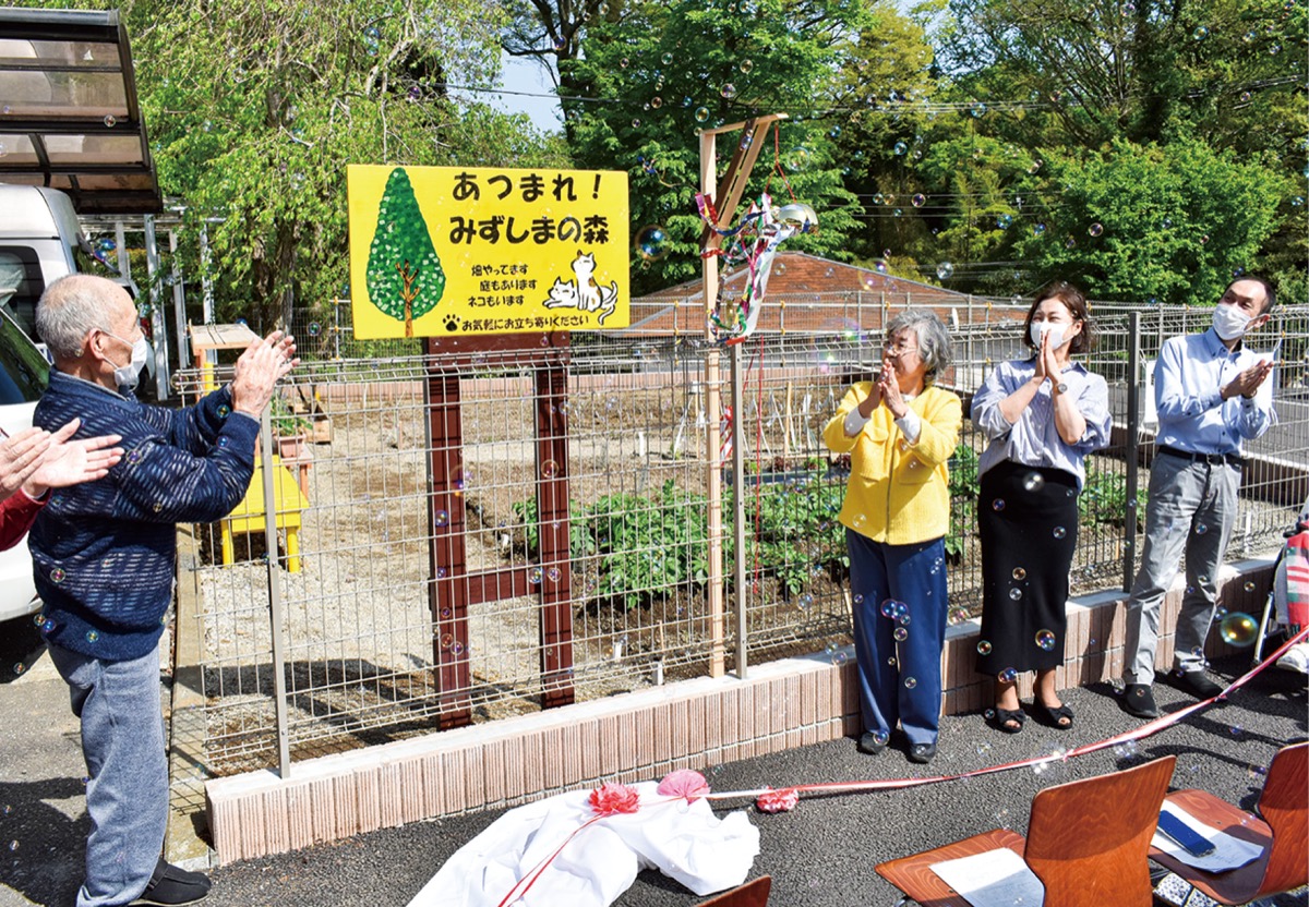緑地の名前は法人職員による投票で「あつまれ!みずしまの森」に決まり、4月22日に看板の除幕式が行われた。水島米子理事長は「皆さんが心置きなく土をいじり、緑に触れられる生活が願いだった。心地よくお過ごしいただけるような施設を目指したい」とあいさつした。