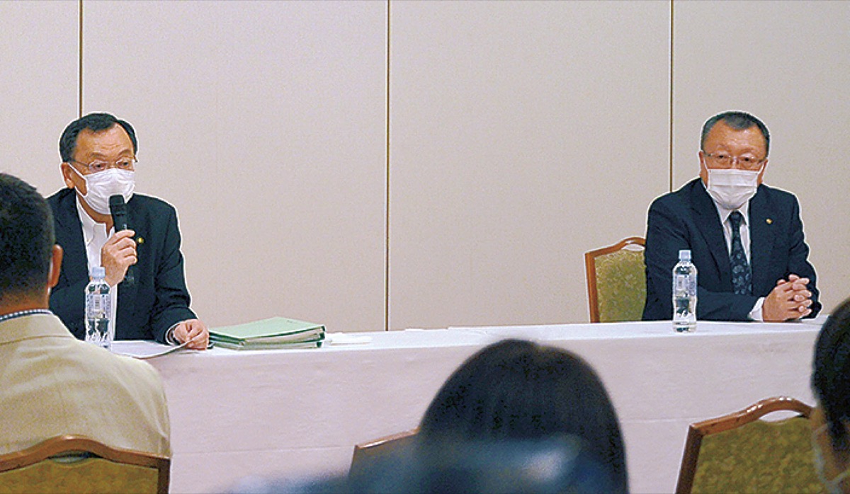 18日に経済団体の平塚経進会が主催したトークセッションでは、落合市長と常盤会頭が湘南海岸公園龍城ケ丘ゾーンの開発整備や中心市街地の活性化について議論を展開した。
