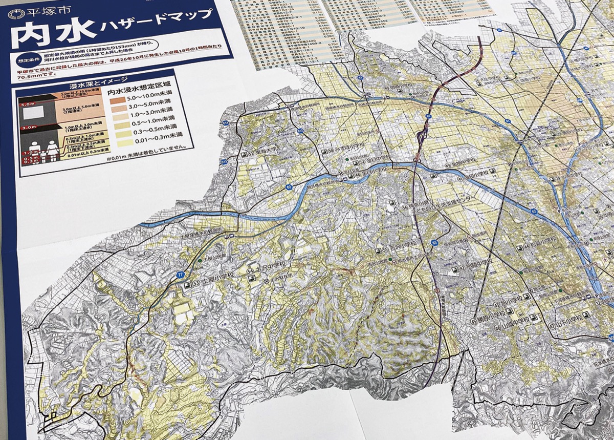 平塚市は「内水ハザードマップ」を9年ぶりに改訂し、広報ひらつか6月第1金曜日号と共に全戸配布した。