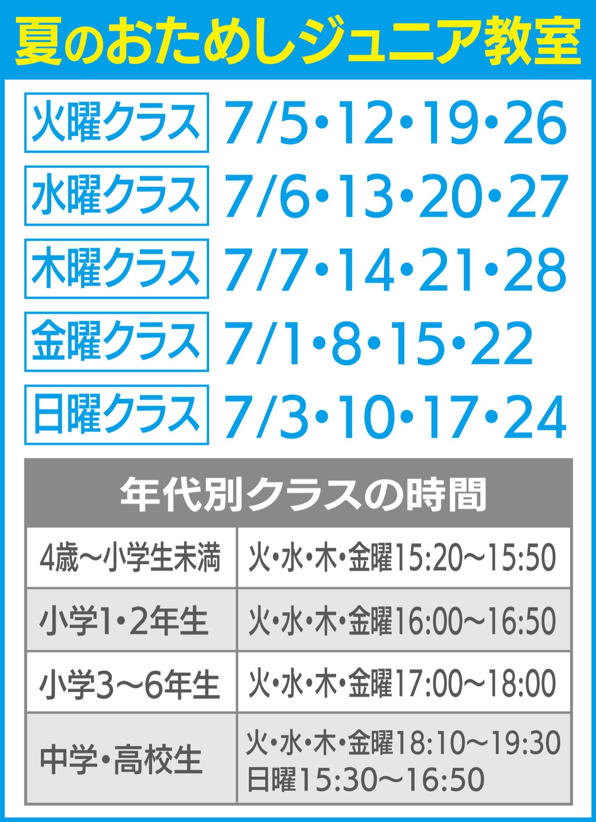 夏の朝得・夜得キャンペーンを7月31日まで実施中。期間中に午前・ナイターの一般クラス入会で、半年間(7月〜12月)の毎月の受講料が15%オフに(通常8800円→7480円)。