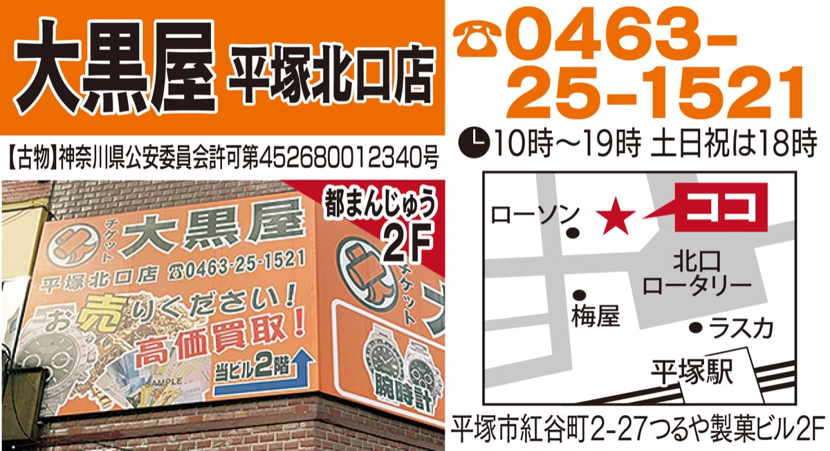 平塚駅北口徒歩1分、都まんじゅう2階にある「大黒屋」は、査定士歴14年のベテラン・大野恭兵店長が親切丁寧に応対してくれると評判の店。「他店では値がつかなった品物も買い取ってくれた」や「どの店よりも高く買い取ってくれた」、「初めての売却で不安に思っていたけど、笑顔で接客してくれたので安心できた」など、喜びの声が多数寄せられている。