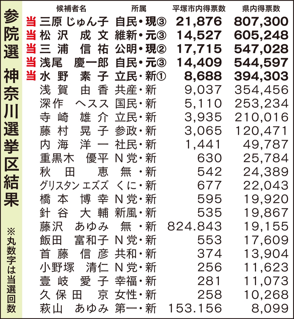 参議院議員選挙の投開票が7月10日に行われた。改選4と欠員補充1の計5議席を過去最多の22人で争った神奈川選挙区は、自民党の現職・三原じゅん子氏(57)が約80万7千票を獲得し、トップ当選。以下、日本維新の会の元職・松沢成文氏(64)、公明党の現職・三浦信祐氏(47)、自民党の元職・浅尾慶一郎氏(58)、立憲民主党の新人・水野素子氏(52)が当選した。