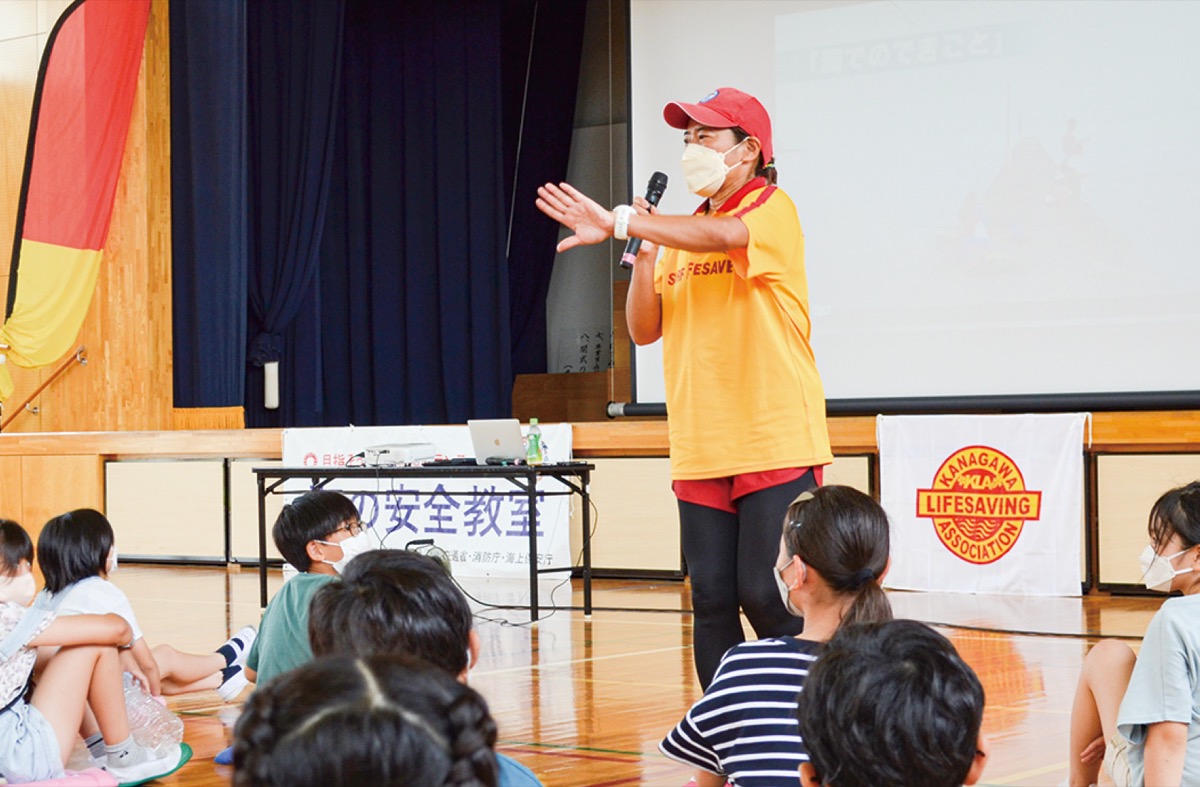 海水浴シーズンを迎え、湘南ひらつかライフセービングクラブが水難事故防止に向けた「水辺の安全教室」を7月上旬に花水小学校で開いた。平塚でも16日に海開きを控える中、児童らは溺れた際の対応などを学んで水辺の危険に対する理解を深めた。