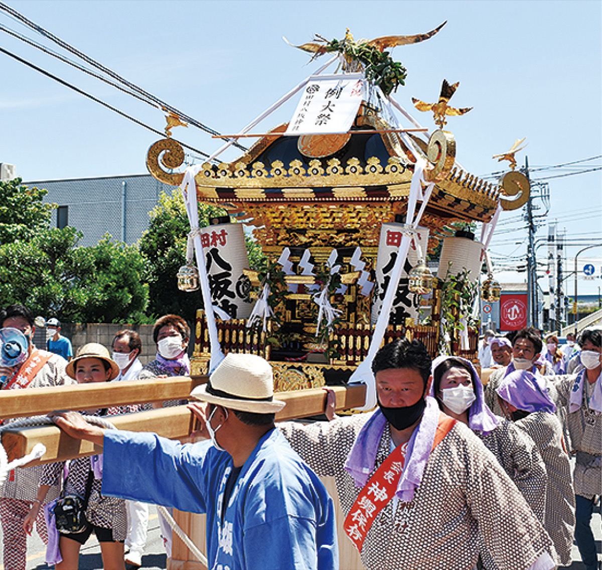 白丁着を身にまとった神輿の担ぎ手や神輿保存会のメンバーらが参加。新型コロナ対策として台車に載せられた神輿とともに町内を練り歩いた。