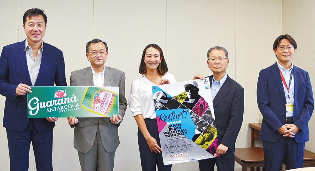 湘南ベルマーレひらつかビーチパークで9月2日(金)から開幕するマイナビジャパンビーチバレーボールツアー2022ガラナ・アンタルチカ杯平塚大会に向け、日本バレーボール協会の川合俊一会長が7月27日、落合克宏市長を訪問した。訪問には大会冠協賛の荒井商事(株)の荒井亮三代表取締役社長や同大会に出場する坂口由里香選手らも同席した。