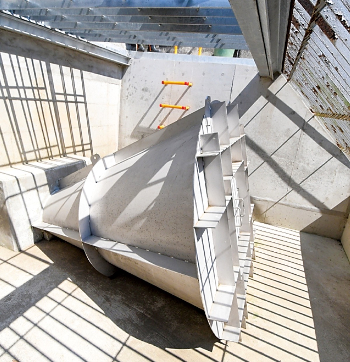 バルブは調整池の排出口に設置するもので、長さ約2・5メートルの円すい形状。これまでは一定量の雨水が貯まると排水する構造だったが、バルブの取水口から取り込んだ水が内部を回転しながら流れる際に空気の柱を発生させ、排出口の面積を減らして流量を抑制できるようになる。