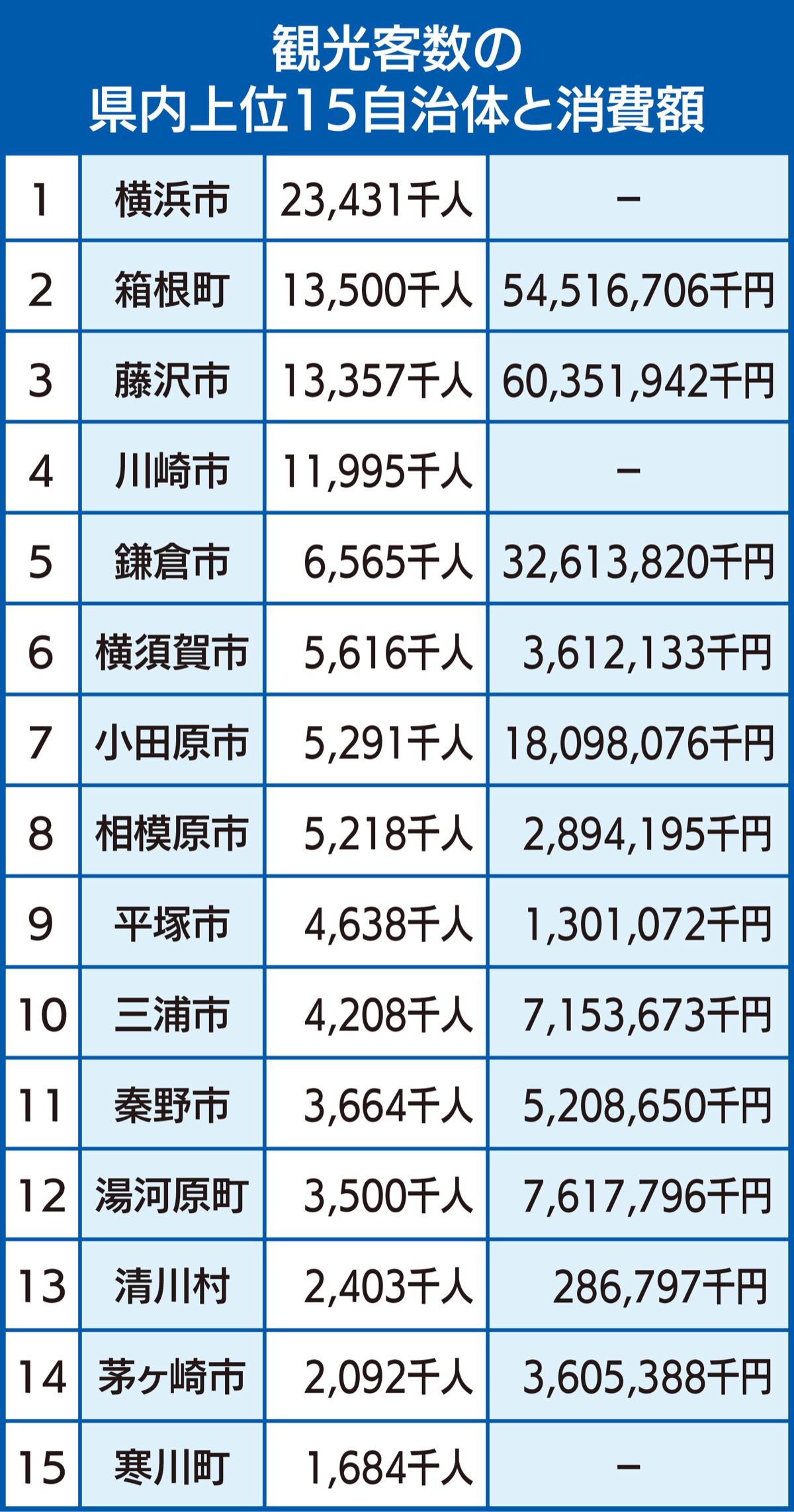 平塚市を含む湘南地域の観光客数は、前年比213万人(7・8%)の増加となる2948万人。藤沢市は1335万7千人で、横浜市(2343万1千人)、箱根町(1350万人)に次いで県内3番目に多かった。茅ヶ崎市(209万2千人)と大磯町(64万9千人)は前年よりも増加したが、鎌倉市は81万人(11%)減って656万5千人だった。