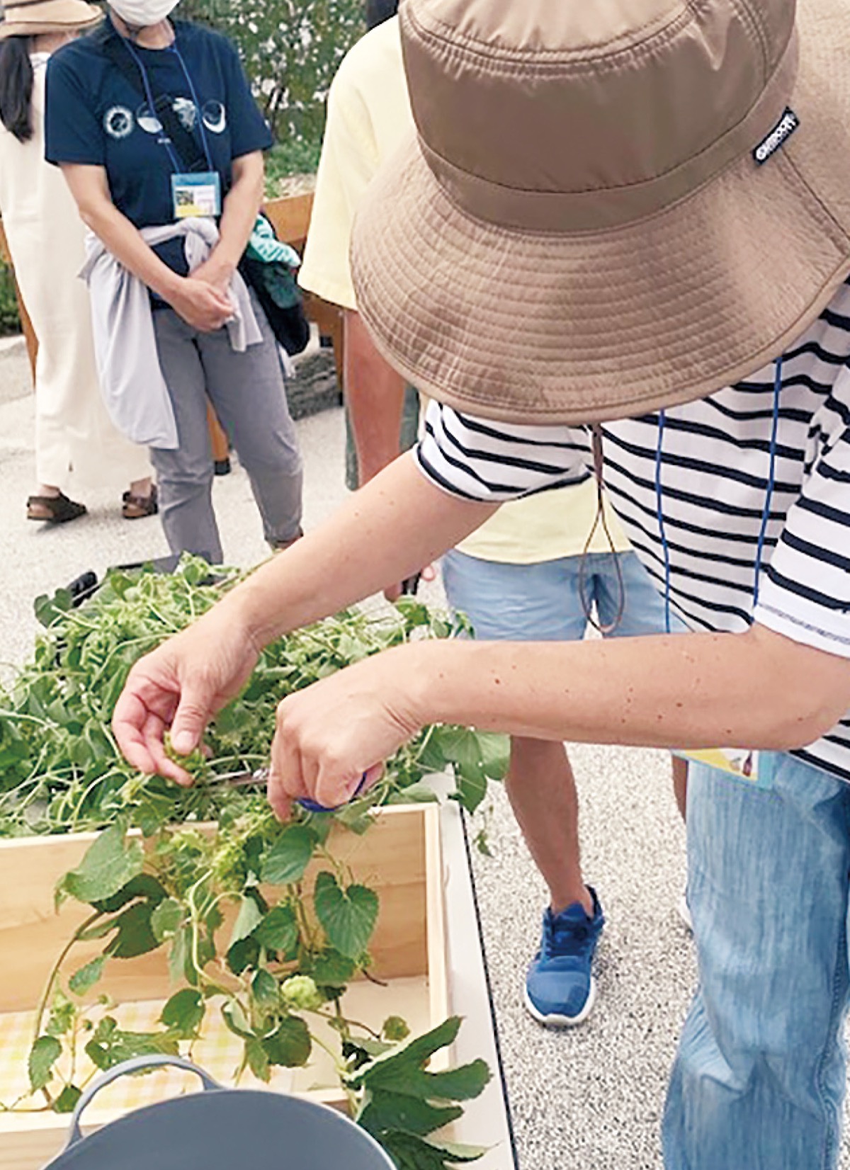 「ラスカホップ」は、同店の屋上庭園ラスカの杜で無農薬栽培されている。8月6日には、同所でホップの収穫体験が実施され、7組16人が参加した。今年は酷暑の影響もあり、昨年よりもホップの生育状況が遅かったという。