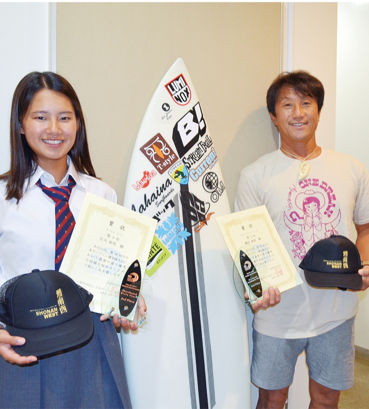 8月20日〜26日に宮崎県で開催された第56回全日本サーフィン選手権大会で平塚・大磯・吉浜海岸を拠点に活動する日本サーフィン連盟湘南西支部(大谷英城支部長)の磯部康典さん(54・唐ケ原在住)がグランドマスタークラスで準優勝、庄司莉花さん(16・湯河原町吉浜在住)がガールズクラスで3位入賞した。