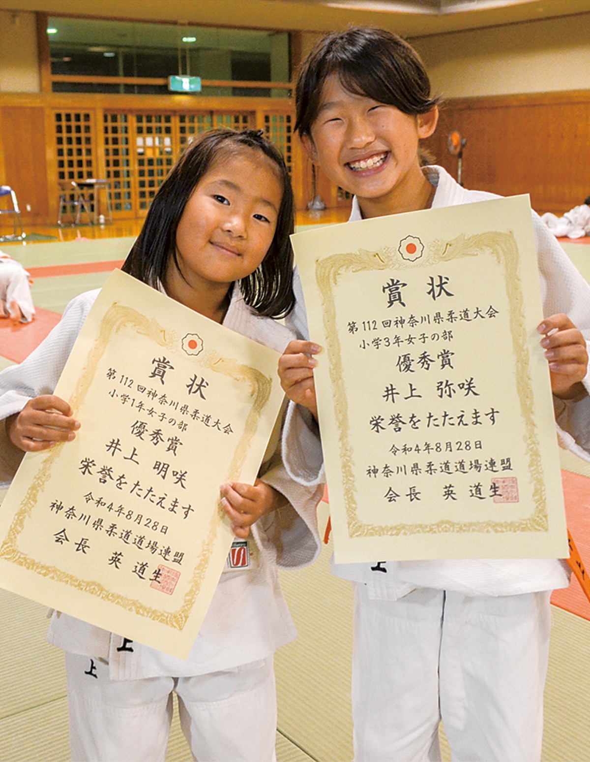 「第112回神奈川県柔道道場連盟大会」が8月28日、神奈川県武道館で開かれ、平塚柔道協会(奥山晴治会長)に所属する井上弥咲(やえ)さん(小学3年)と明咲(あさ)さん(同1年)姉妹が、それぞれ3人抜きを果たし優秀賞を受賞した。