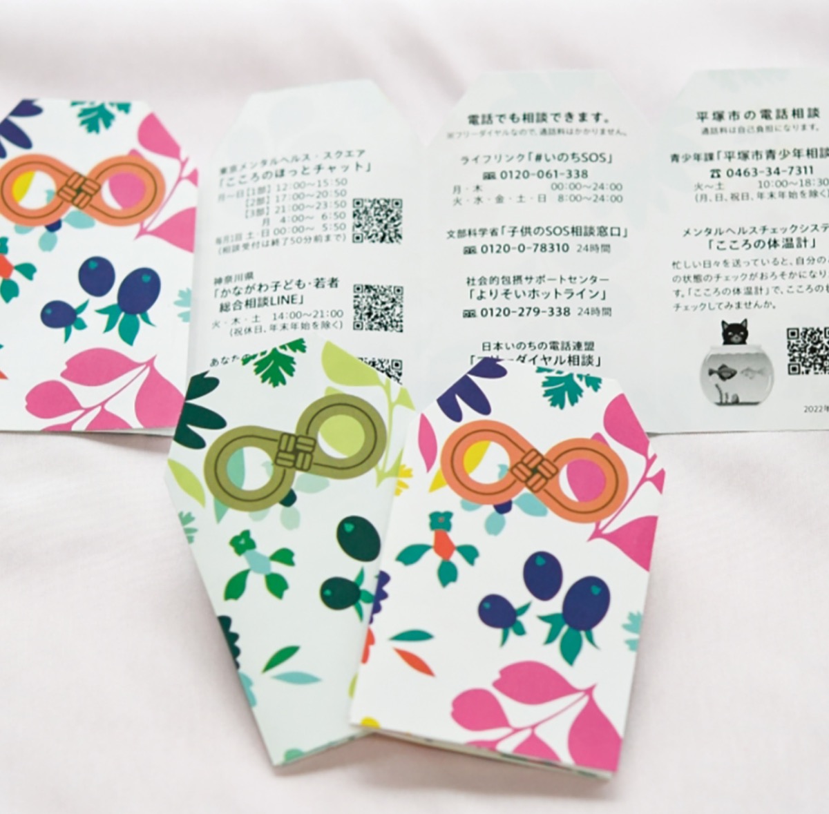 表面のデザインは平塚市出身のオノルイーゼさんが手がけた。様々な花が描かれており、カモミール「逆境に耐える、苦難の中の力」やムラサキケマン「あなたの助けになる」など、それぞれの花に自殺対策を意識した花言葉を忍ばせている。市担当者は「お守りサイズなので携帯しやすく、相談先のホームページの二次元コードを入れました。持ち歩いてもらえれば」と話している。