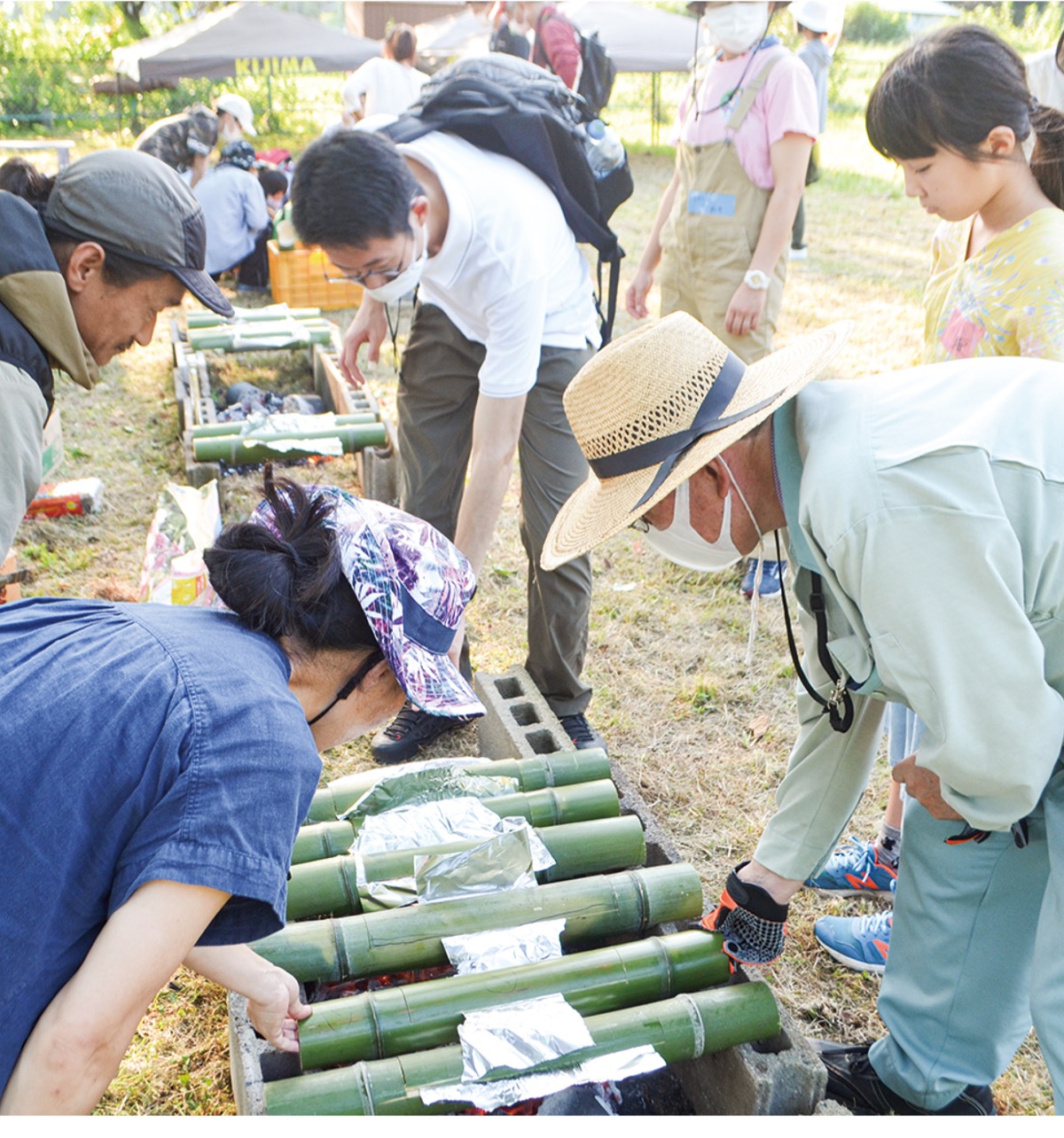 城所の風土や歴史に触れながら、遊びを通じて自然を体験する夏休みのイベント。当日、参加者は城所公園を出発し、浄心寺、砲台跡などを巡りながら地元の歴史に耳を傾けた。公園に戻ると竹細工の体験教室が開かれ皿やコップを制作。竹の飯ごうを使って炊いた米でカレーを作り、自分たちが制作した食器を使って夕食を囲んだ。石塚委員長に葉っぱでロケットを作る昔ながらの遊びを教わった子どもたちは、「やった、飛んだ」と歓声を上げていた。