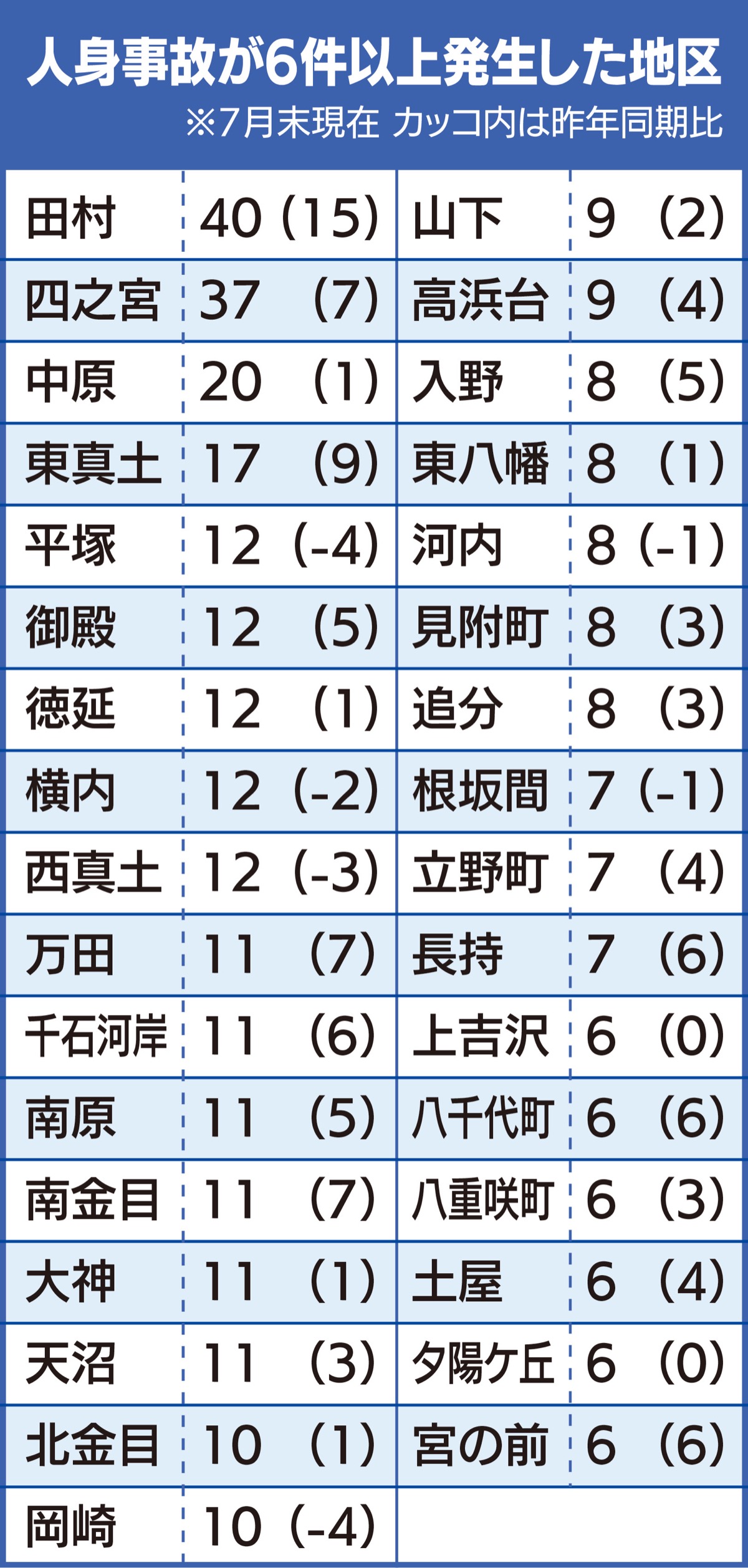 同署がまとめた今年7月までの町名別発生件数では、田村が最多となる40件、四之宮37件、中原20件、東真土17件と続いた。同署は「主要な国道、県道沿いや大きな交差点などでの事故が目立つ」という。