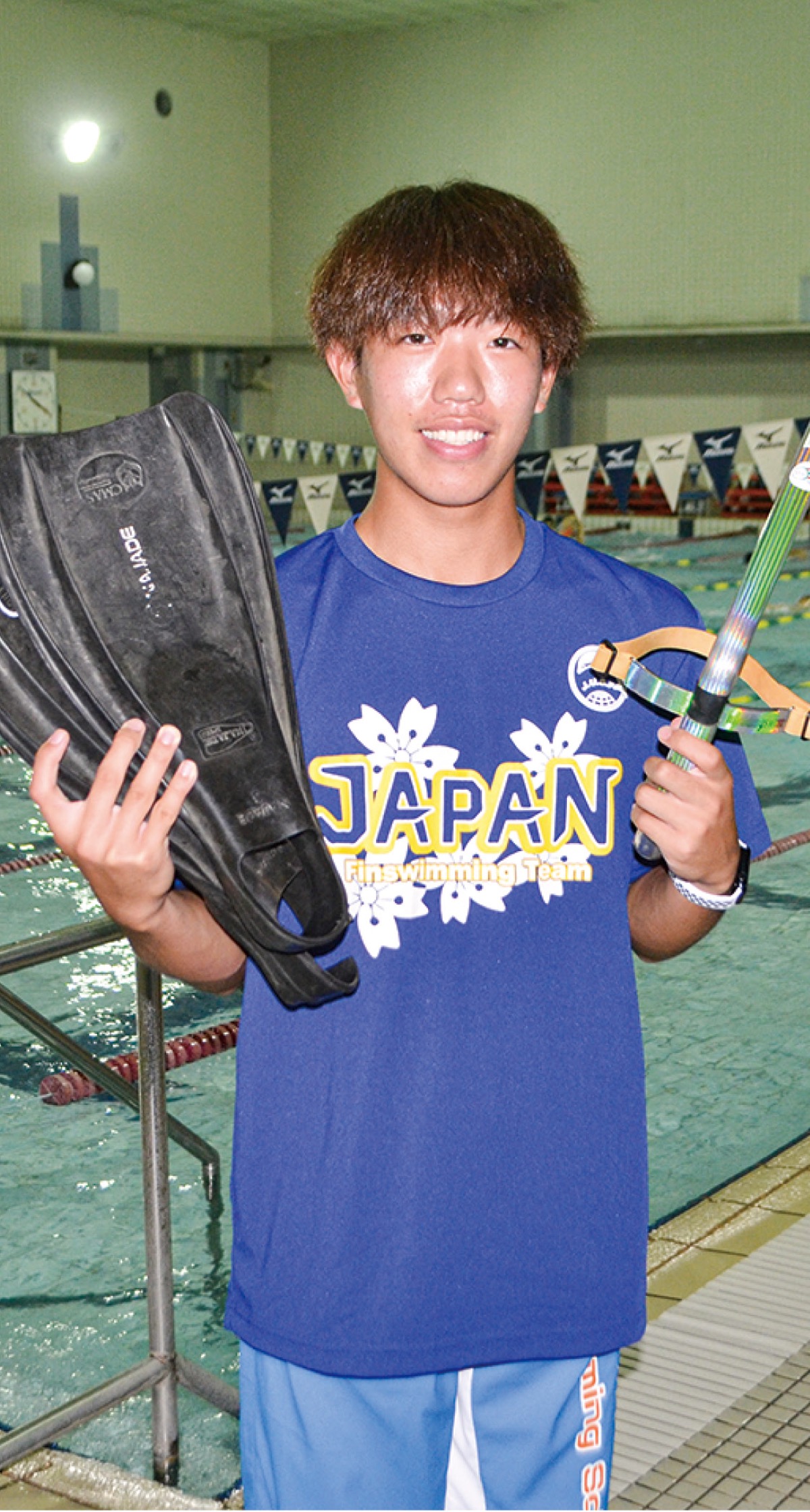 ビーフィンは足ヒレを片足ずつ装着し、シュノーケルを着けてクロールで泳ぐ種目。松田さんは5月の日本選手権大会50mビーフィンで23秒92の自己ベストを記録し、17歳以下ジュニア部門で1位入賞。初の日本代表入りを果たした。松田さんは競技の魅力を「体感速度が全然違う。同じ50mでもタイムが3、4秒変わってくる」と話す。